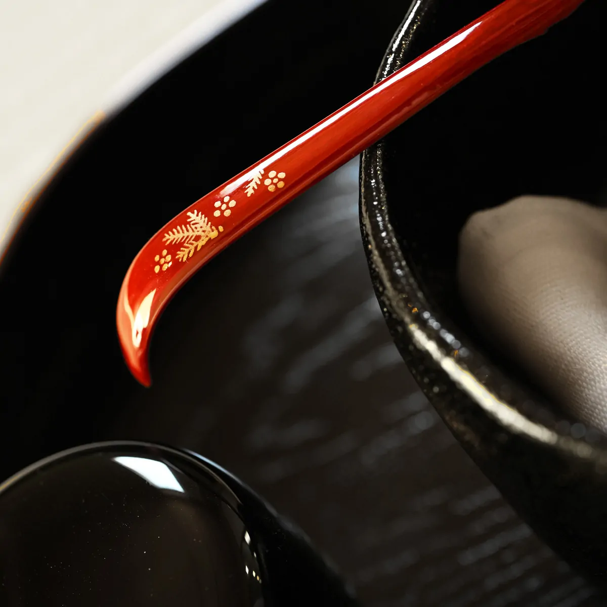 Bamboo tea scoop for matcha coated with red urushi lacquer and hand-painted with gold.