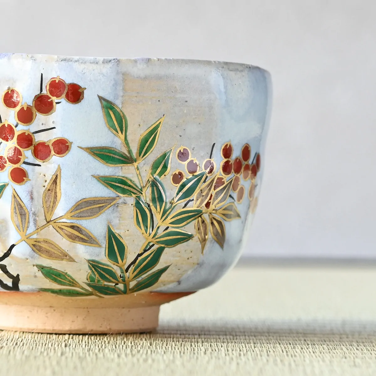 Handmade and hand-painted matcha tea bowl decorated with red and white nanten