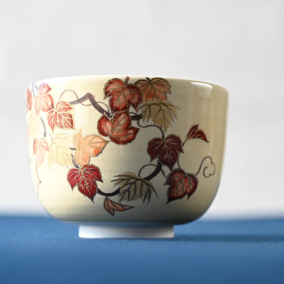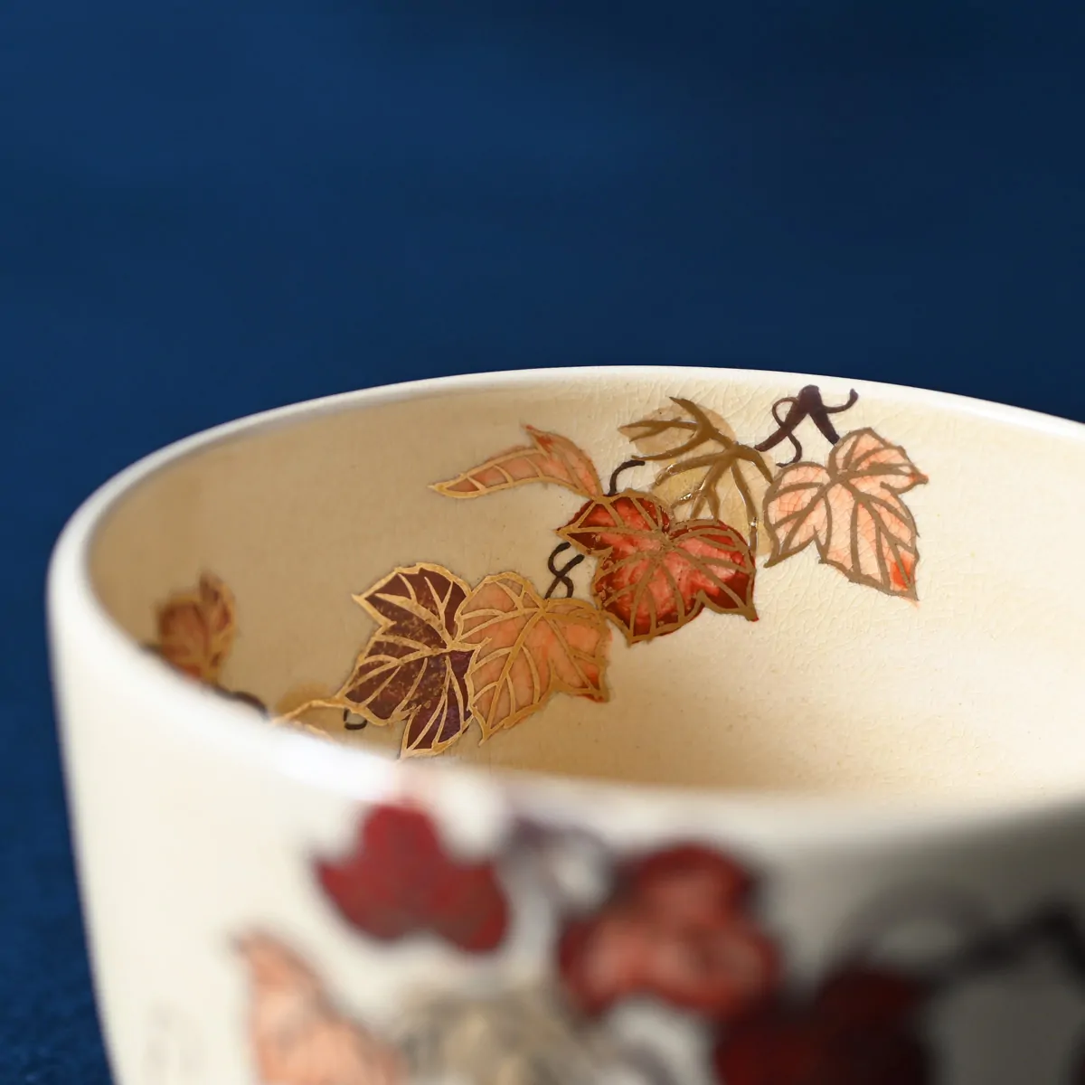 Handmade matcha tea bowl hand-painted with ivy leaves.