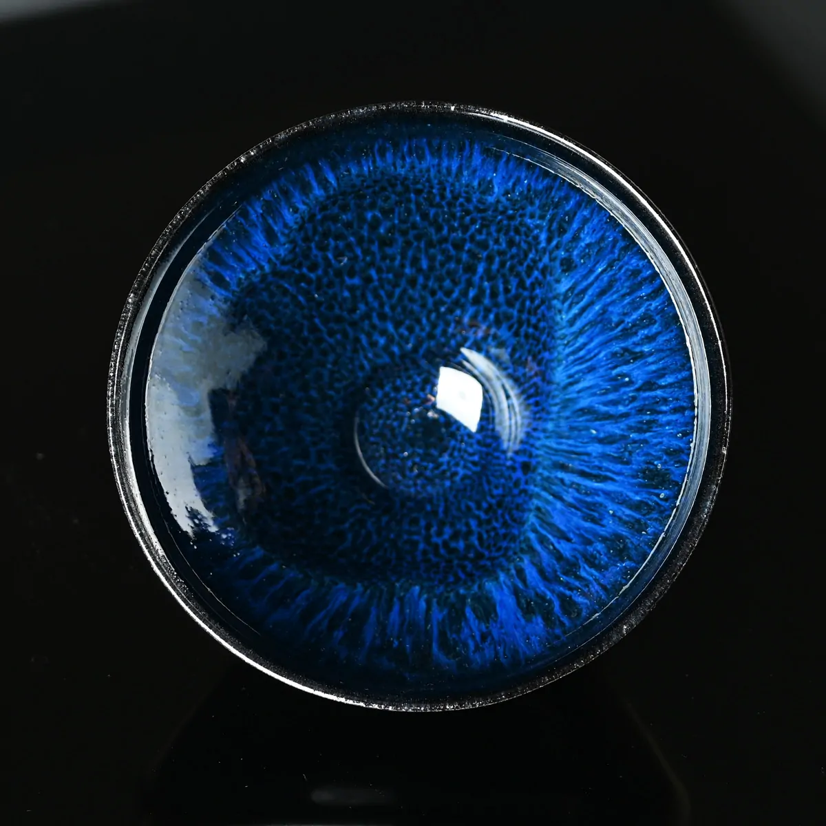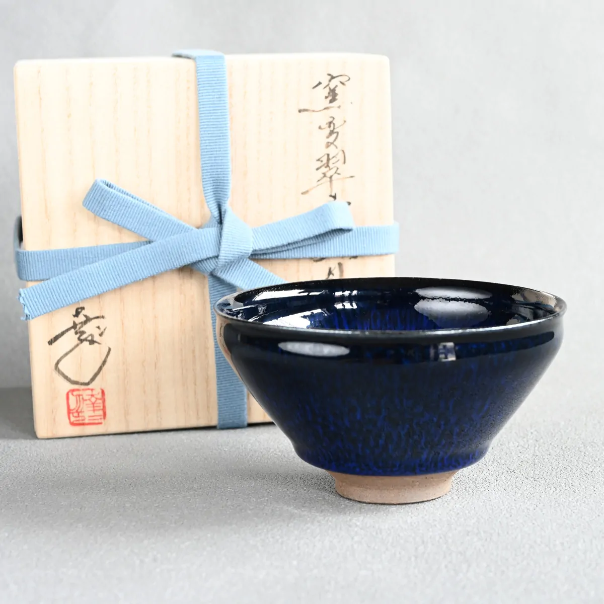 Suisei Tenmoku (翠青天目) means “jade‑blue tenmoku” which is a deep blue‑tinged variant of traditional tenmoku glaze. The blue streaks against the dark tenmoku glaze evoke a beautiful, clear, starry night.