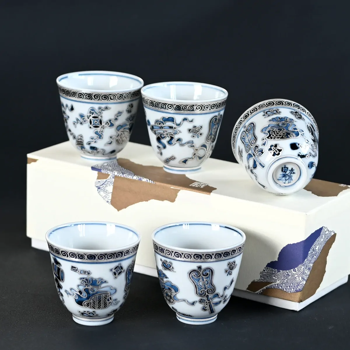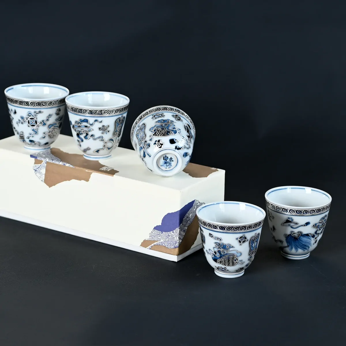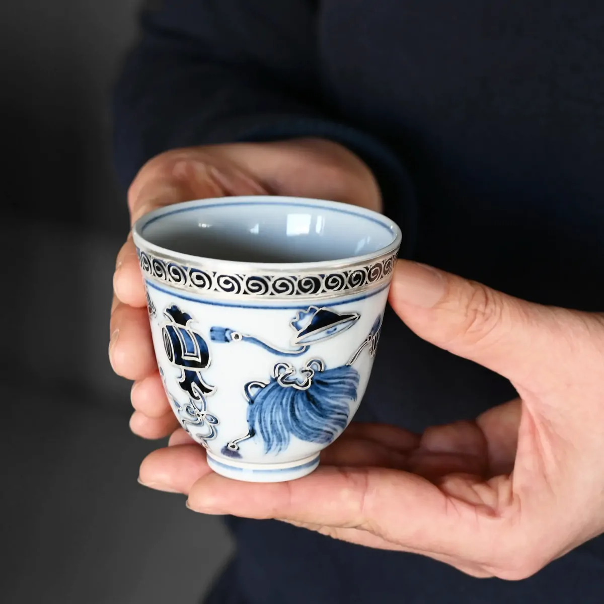 The tea cup features "takarazukushi", which is a traditional Japanese design motif that means “an assortment of treasures.” It refers to decorative patterns that feature a collection of symbolic lucky items—such as coins, scrolls, mallets, and other auspicious objects—arranged together. These motifs represent good fortune, prosperity, and abundance.