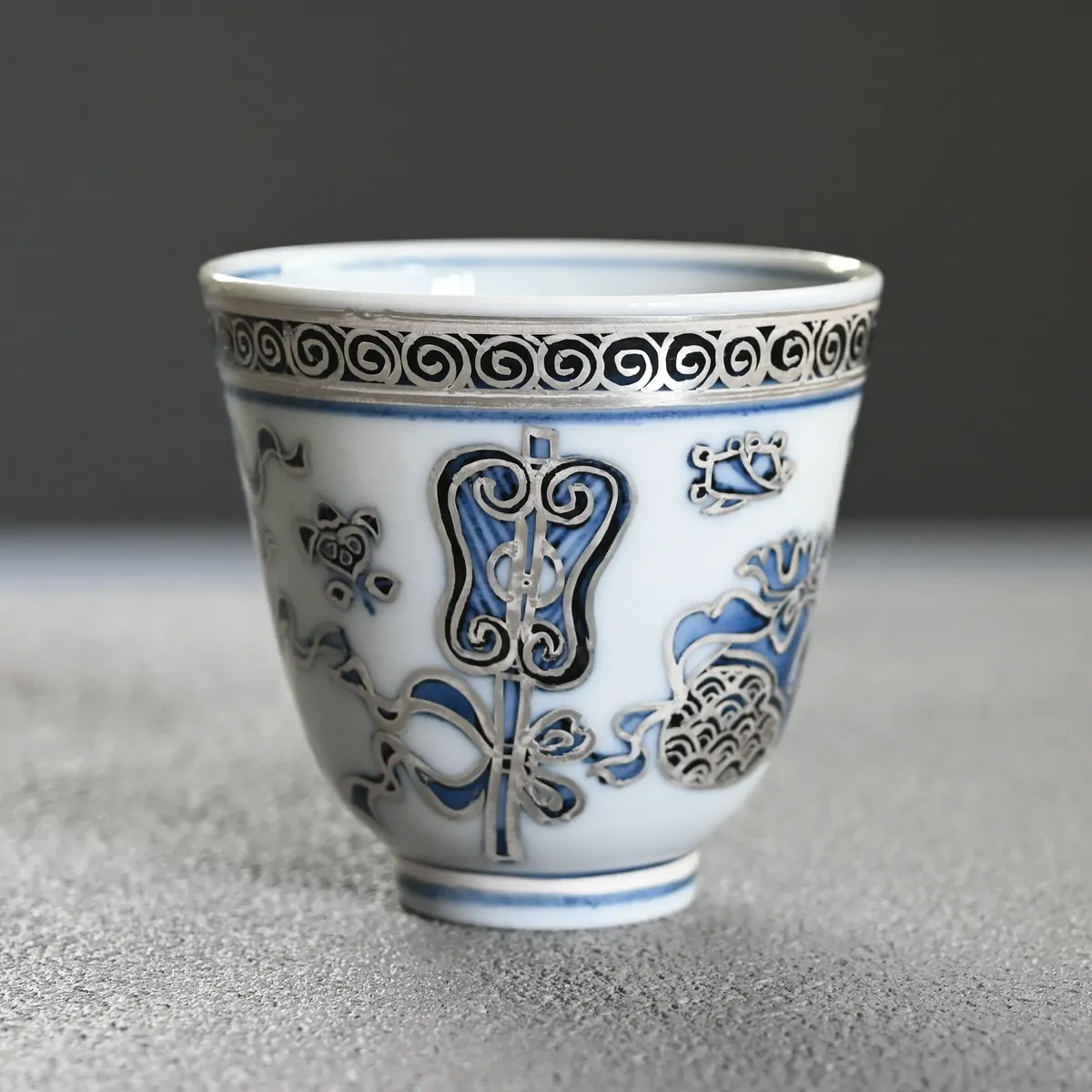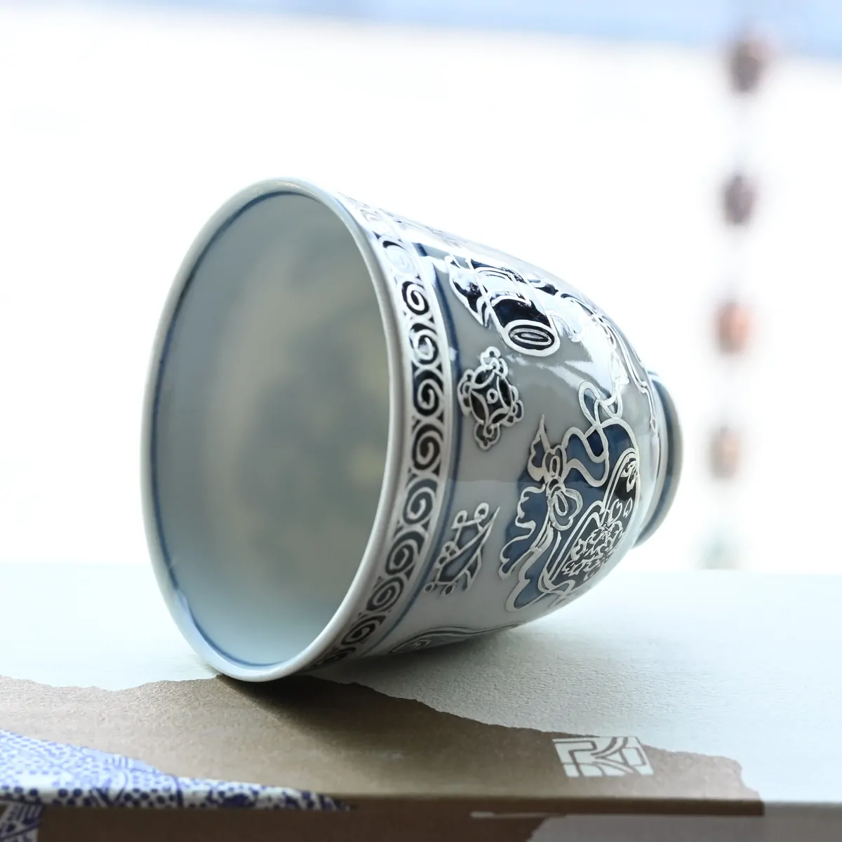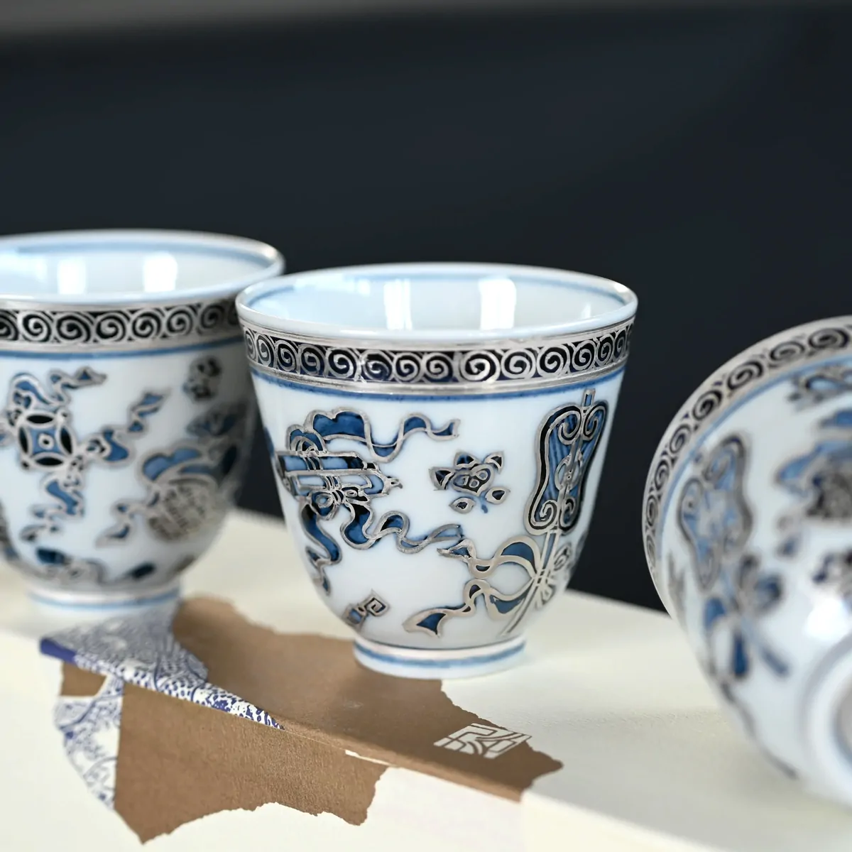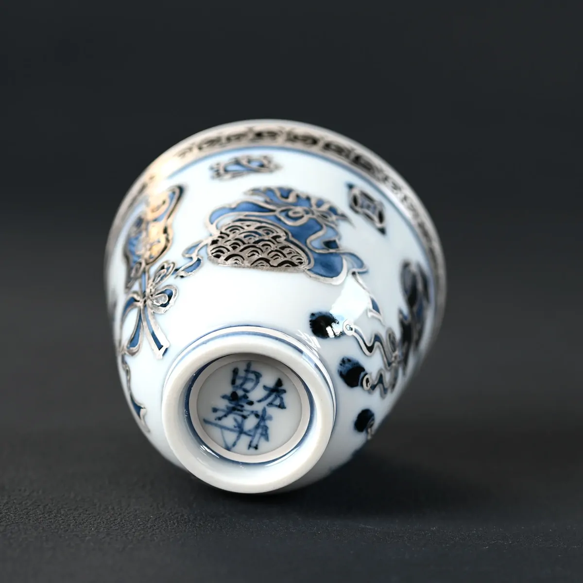 The tea cup features "takarazukushi", which is a traditional Japanese design motif that means “an assortment of treasures.” It refers to decorative patterns that feature a collection of symbolic lucky items—such as coins, scrolls, mallets, and other auspicious objects—arranged together. These motifs represent good fortune, prosperity, and abundance.
