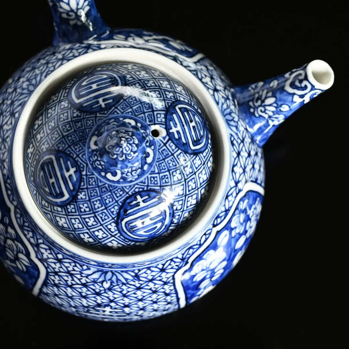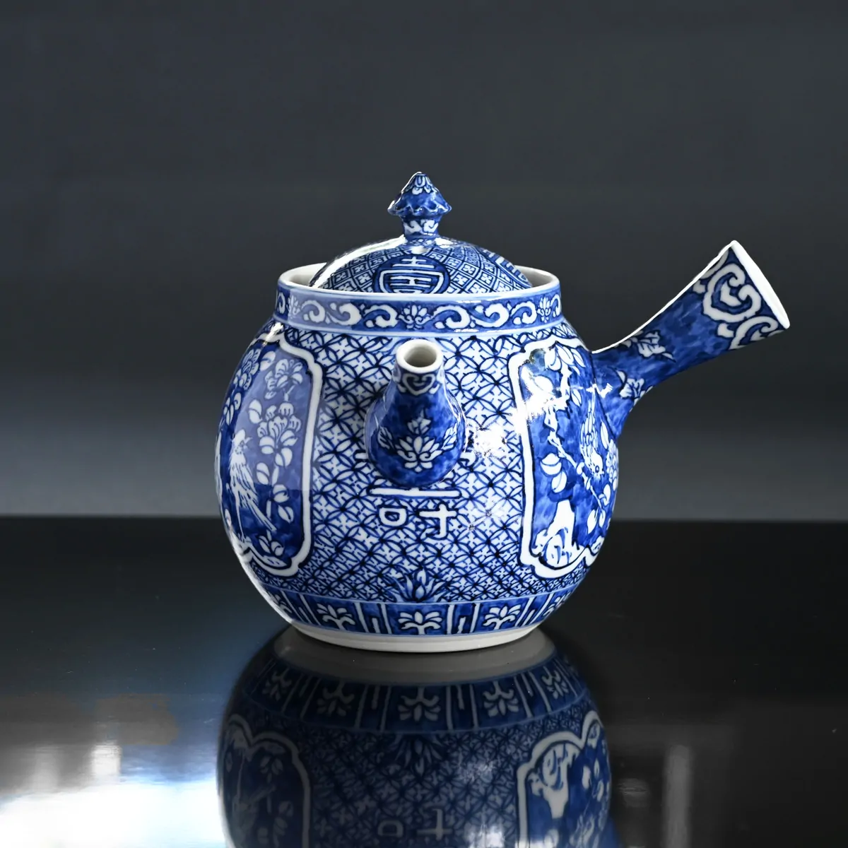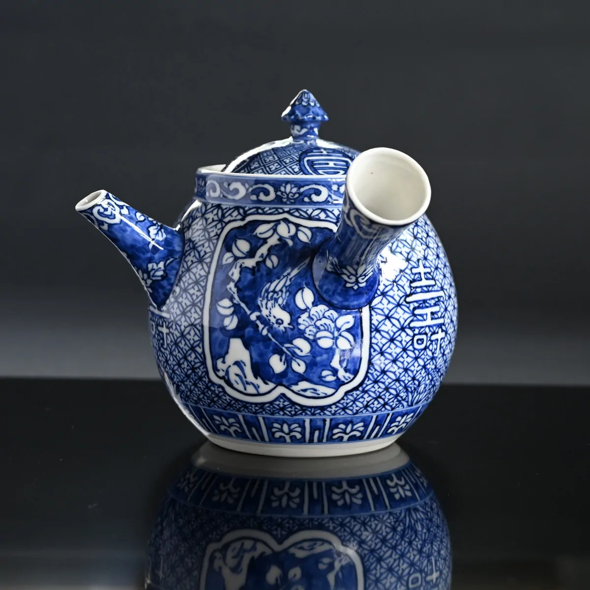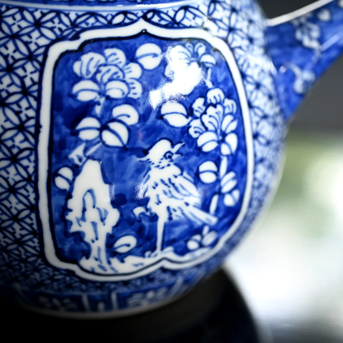 On the teapot in medallions resembling zen buddhist temple windows, there are hand-painted scenes of birds resting on tree branches surrounded with imaginary flowers. This fine blue under-glazing style is called Shonzui and it originates from China. It was produced in private kilns in Jingdezhen during the late Ming Dynasty (1628–1644). The porcelain features detailed brushwork using cobalt blue pigment, applied before glazing and firing at high temperatures to achieve a vivid, durable finish.