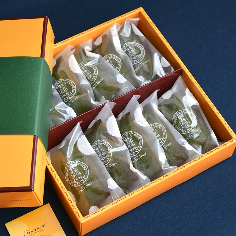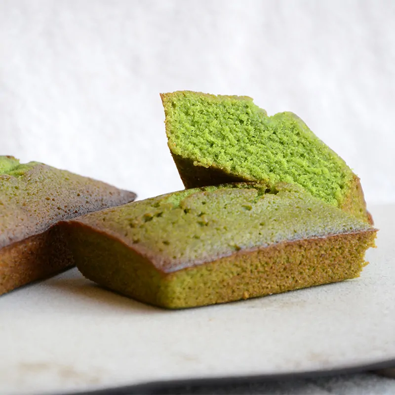 10 pieces of almond sponge cakes made of high quality natural ingredients, flavored with green tea powder.