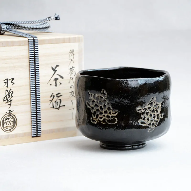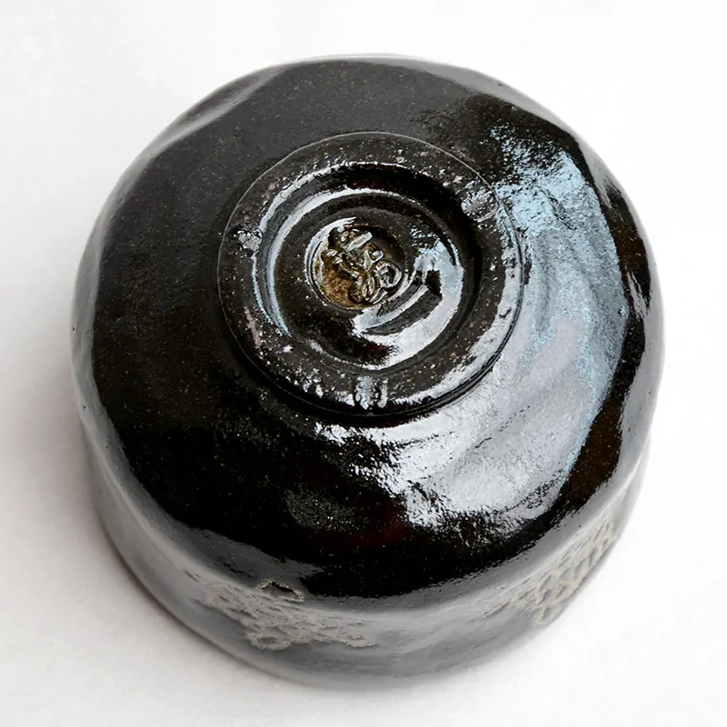 This chawan was made in the Chojiro style. While its overall appearance is not highly distinctive, it shows Tokunyu’s unique touch: turtles (kame) are drawn in clear glaze on the black Raku surface, a detail not found in Chojiro’s work.