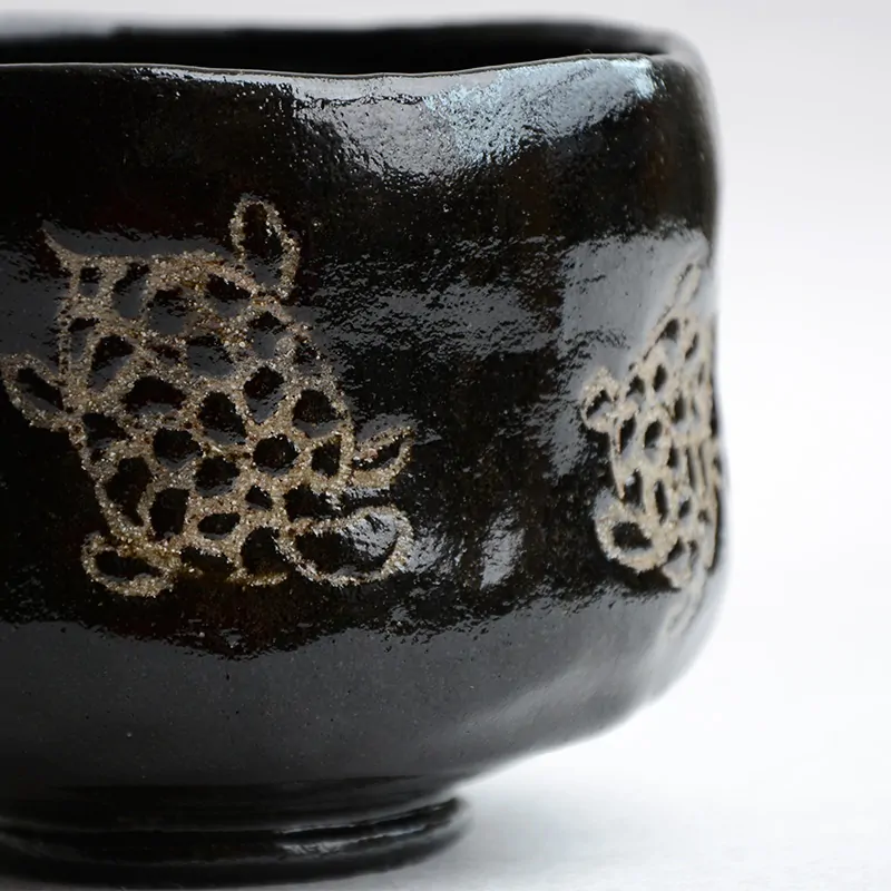 Black matcha tea bowl decorated with turtles from the Shōraku Kiln