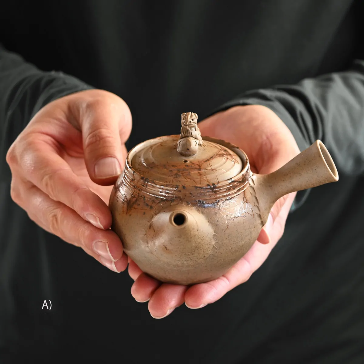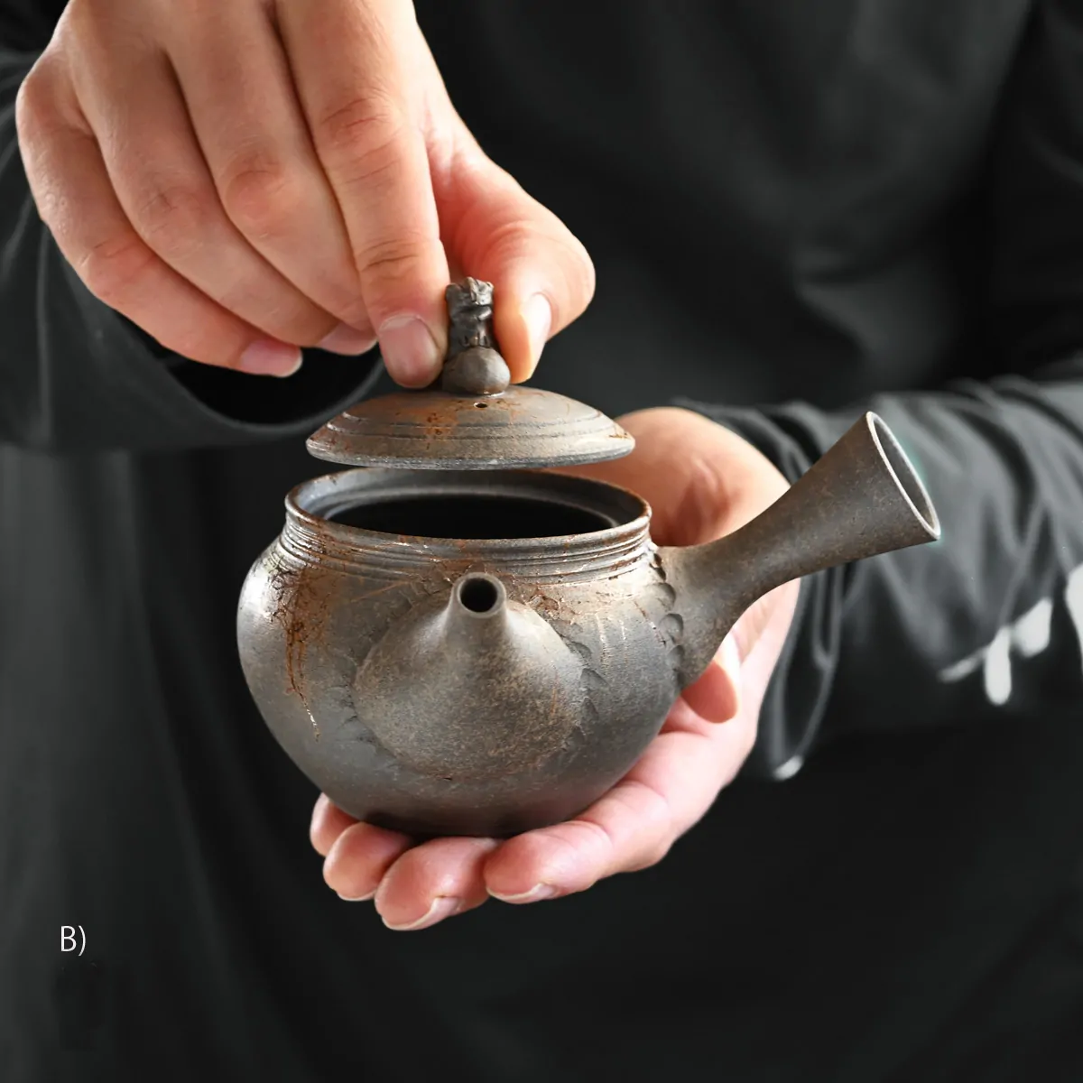 B) Tanka Mogake Shishi Kyusu Agyō — Capacity: 200 ml. Tanka, literally meaning "carbonization", is a technique, when the ceramic ware is fired for over 30 hours in a reduction chamber which gives it a darker, grey tone.