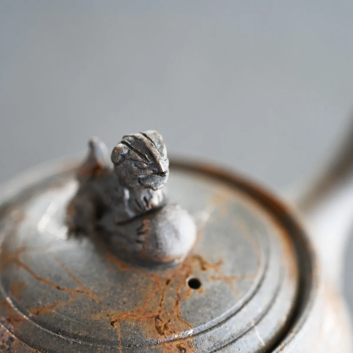 The teapot is decorated with a guardian lion, also called as "shishi". The lion holds a ball which represents the material elements. Agyō is the open-mouthed guardian commonly seen in pairs at the entrances of Buddhist temples in Japan. The open mouth symbolizes the first sound “ah,” representing birth, beginnings, and the outward expression of life. Ah-Un is the paired concept of Agyō (open mouth) and Ungyō (closed mouth), symbolizing the beginning and end of all things—similar to “alpha and omega.” Together, they represent the full cycle of existence and the balance of life.