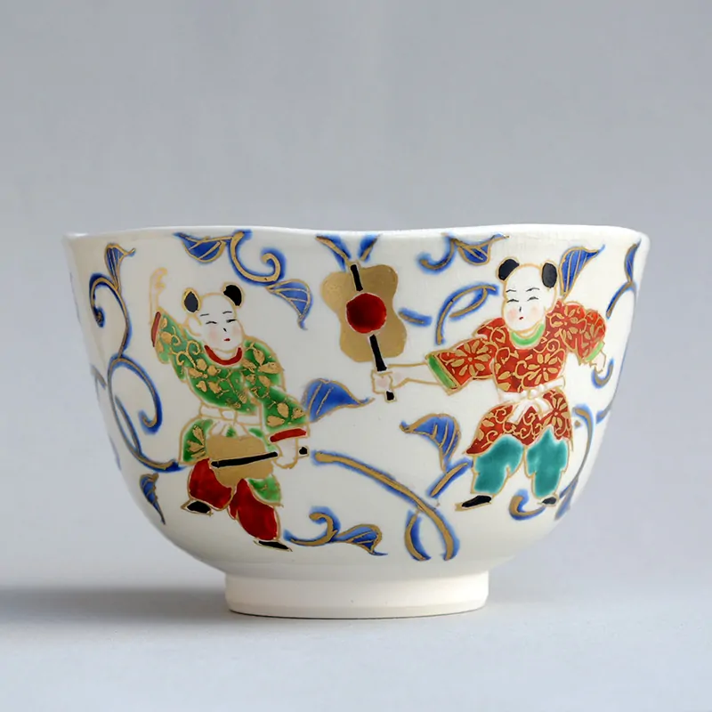 Matcha tea bowl decorated with playing children from Ikkyū kiln