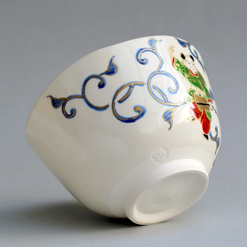 Handmade and hand-painted tea bowl decorated with children playing with a Gunpai (war fan).