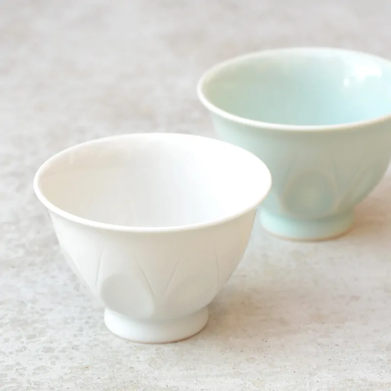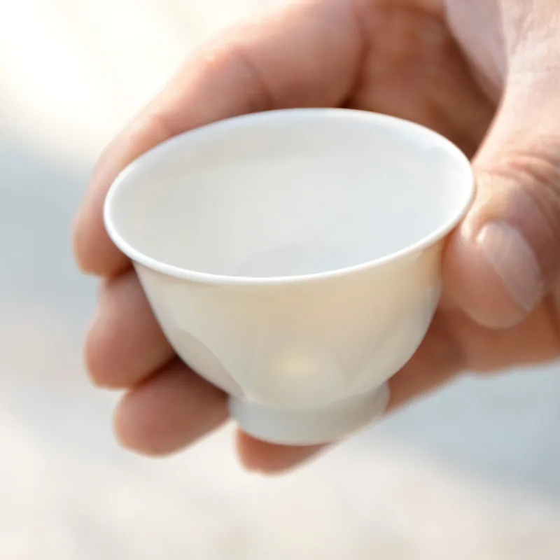 The cup is translucent on the bottom due to the thinner walls. Seeping through the walls, the light paints beautiful petal patterns on the inside.