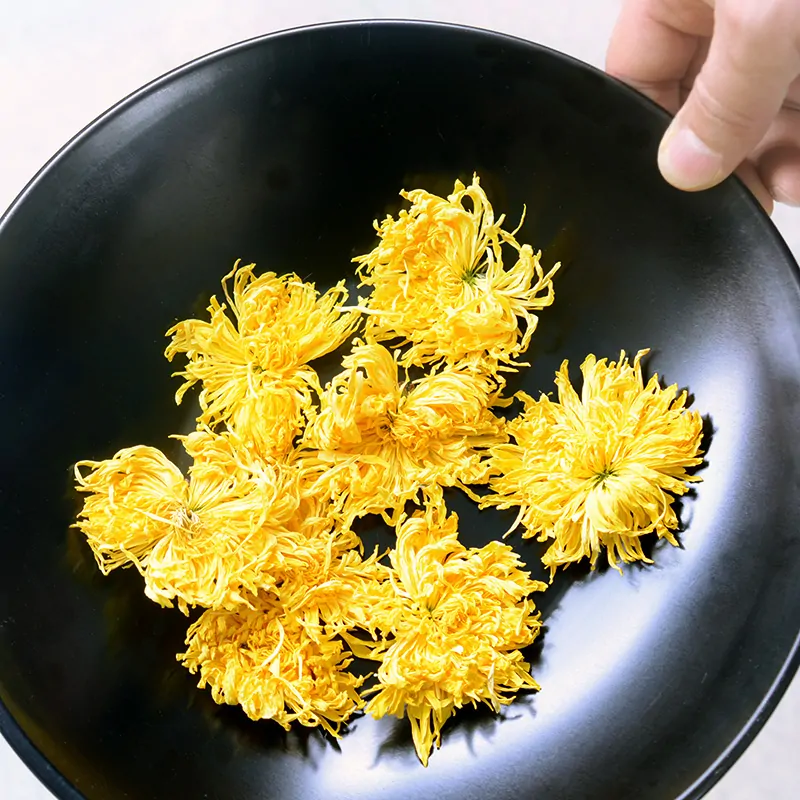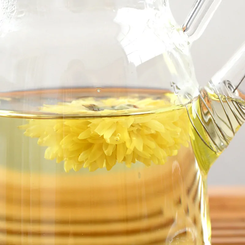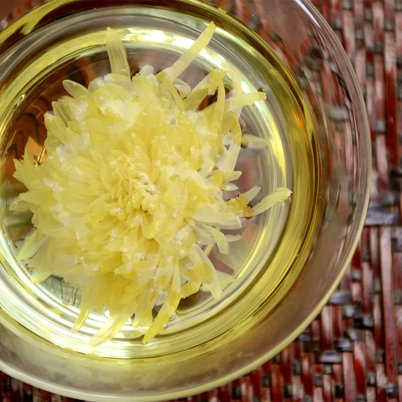 The perfumed, flowery scent and sweet, herbal taste of the chrysanthemum tea helps relieve the everyday stress and refreshes the soul. Even the sight of the beautiful flower "blooming" in the water brings relaxing moments.
