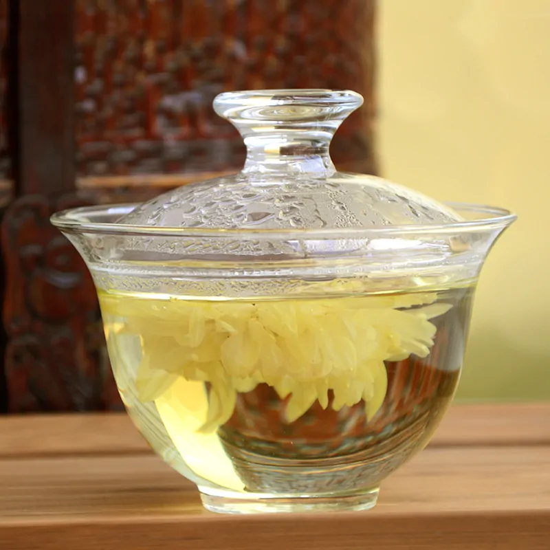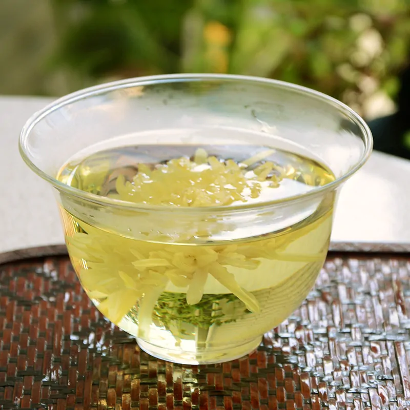 When pouring the hot water into a heat-resistent cup you can see the "dance" of the chrysanthemum flower.
