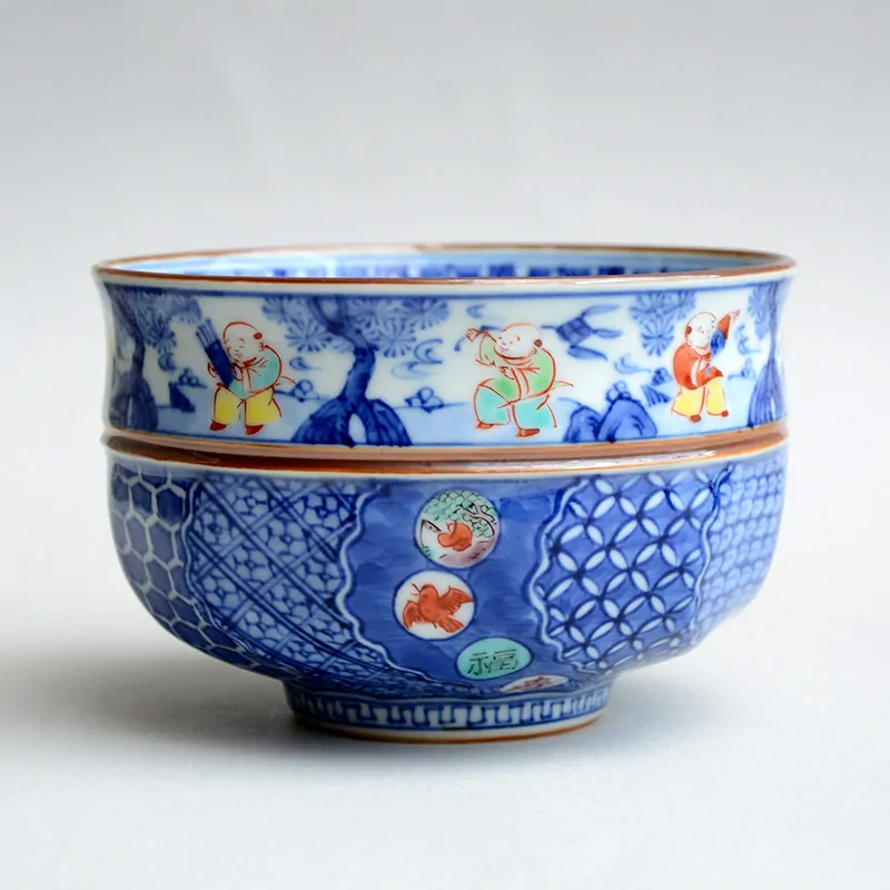 The tea bowl depicts "karako", playing children. The motif is taken from the Chinese symbolism. The reign of the Ming Dynasty was not a peaceful time, there were wars, several outside tribes attacked the empire. Due to the constant bloodshed, the population dropped drastically, so they appreciated children more than ever. The word “karako” means "Tang child", and depicting them has become a symbol of great luck and innocence.