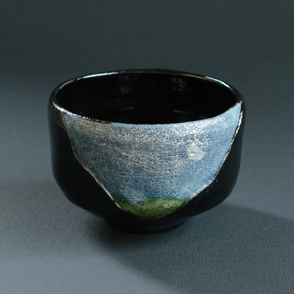 Black Raku matcha tea bowl decorated with a moonlit landscape.