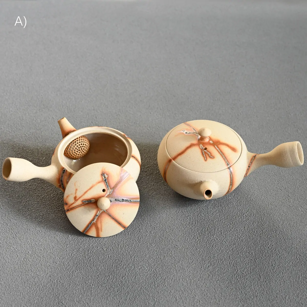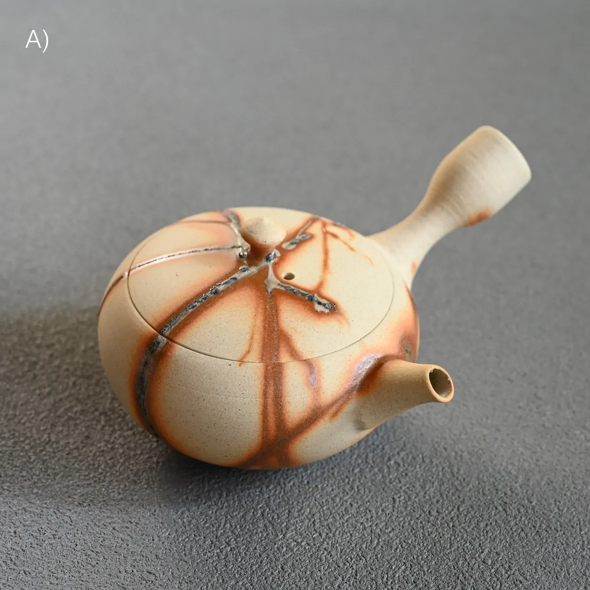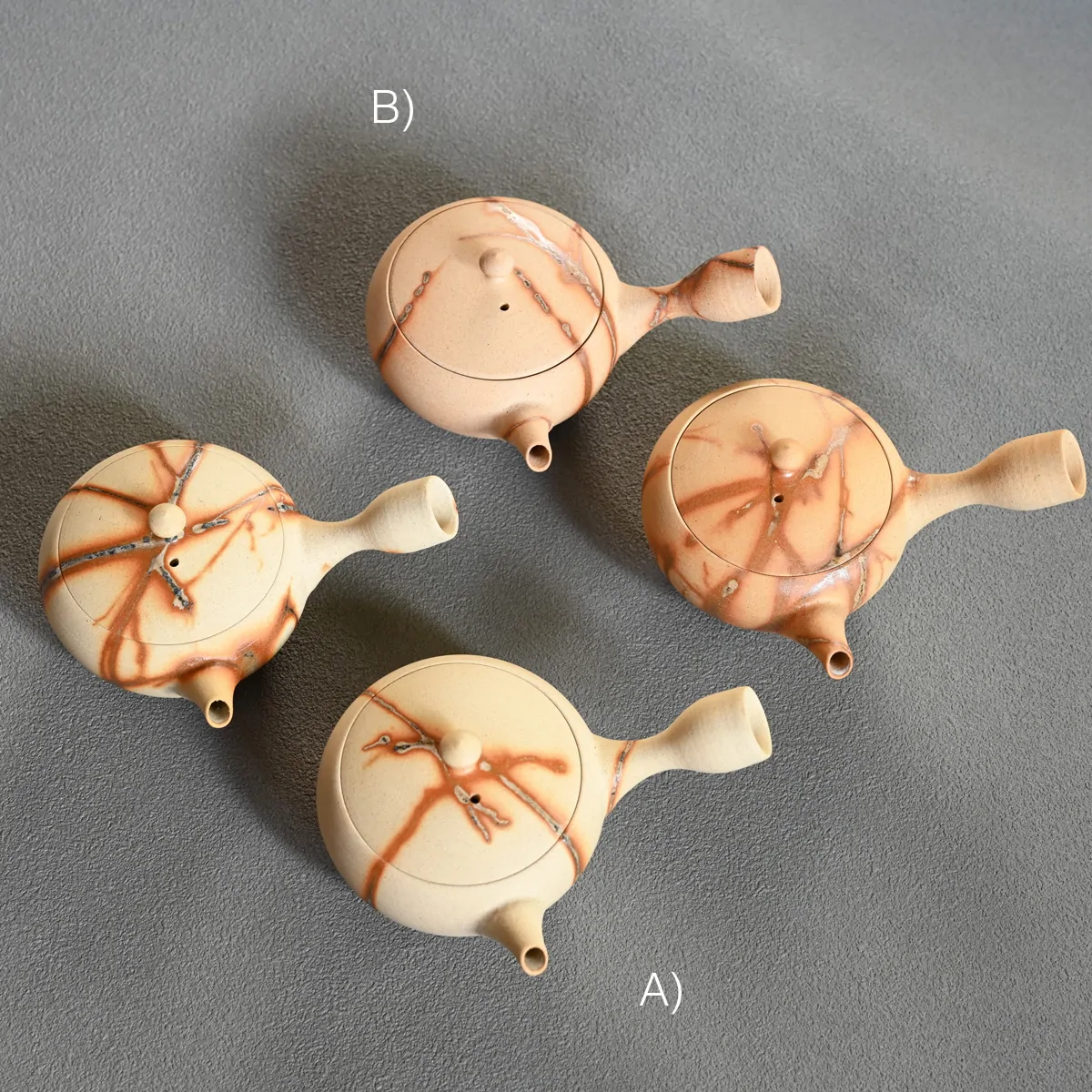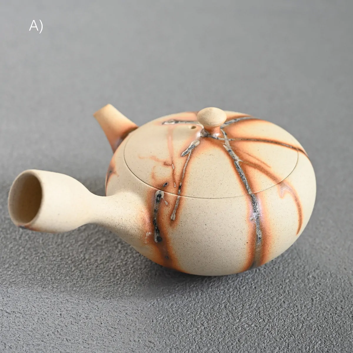 This captivating finish is created using the Hidasuki technique. Before the final firing, the teapot is carefully wrapped in rice straw. As the straw burns, it reacts with the iron in the clay, forming distinctive scarlet streaks known as the Hidasuki pattern. Since the Hidasuki pattern is created through a natural and unpredictable process, each piece will have slight variations in its design. These unique differences enhance the artistic value of the teapot. If you would like to see the exact piece before purchase, please feel free to request photos.