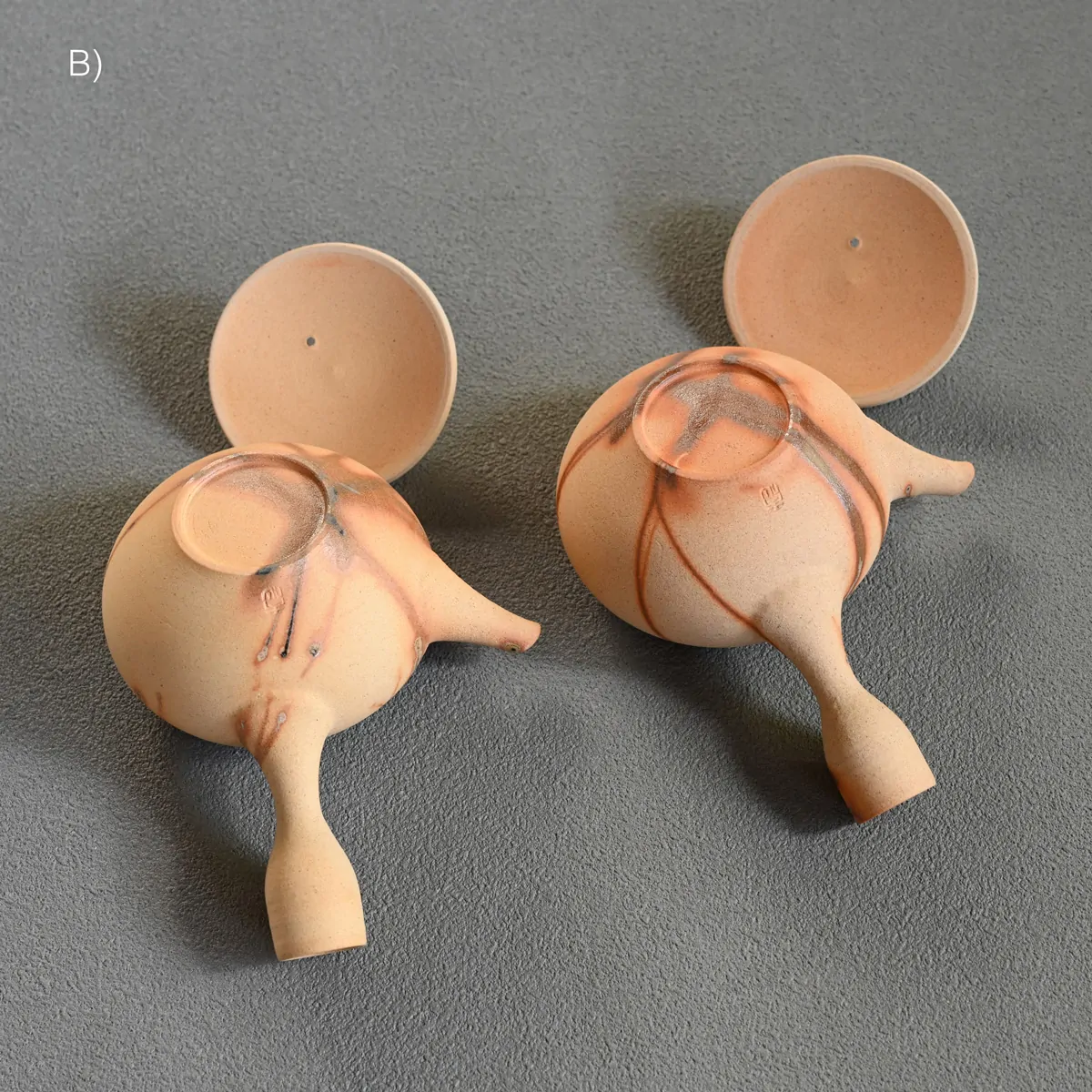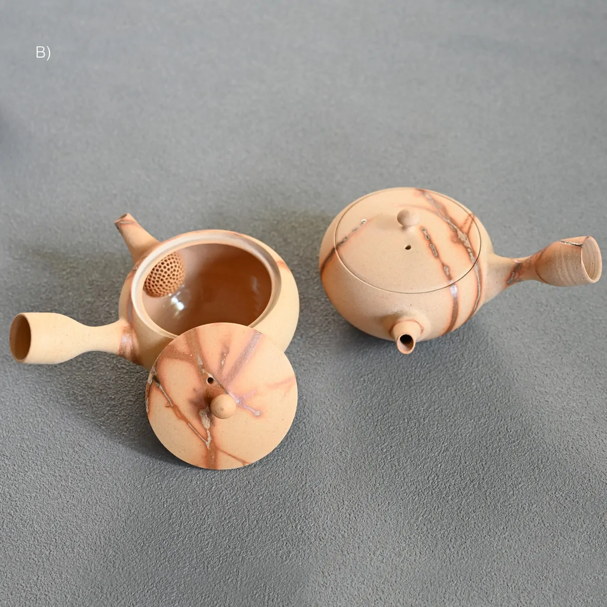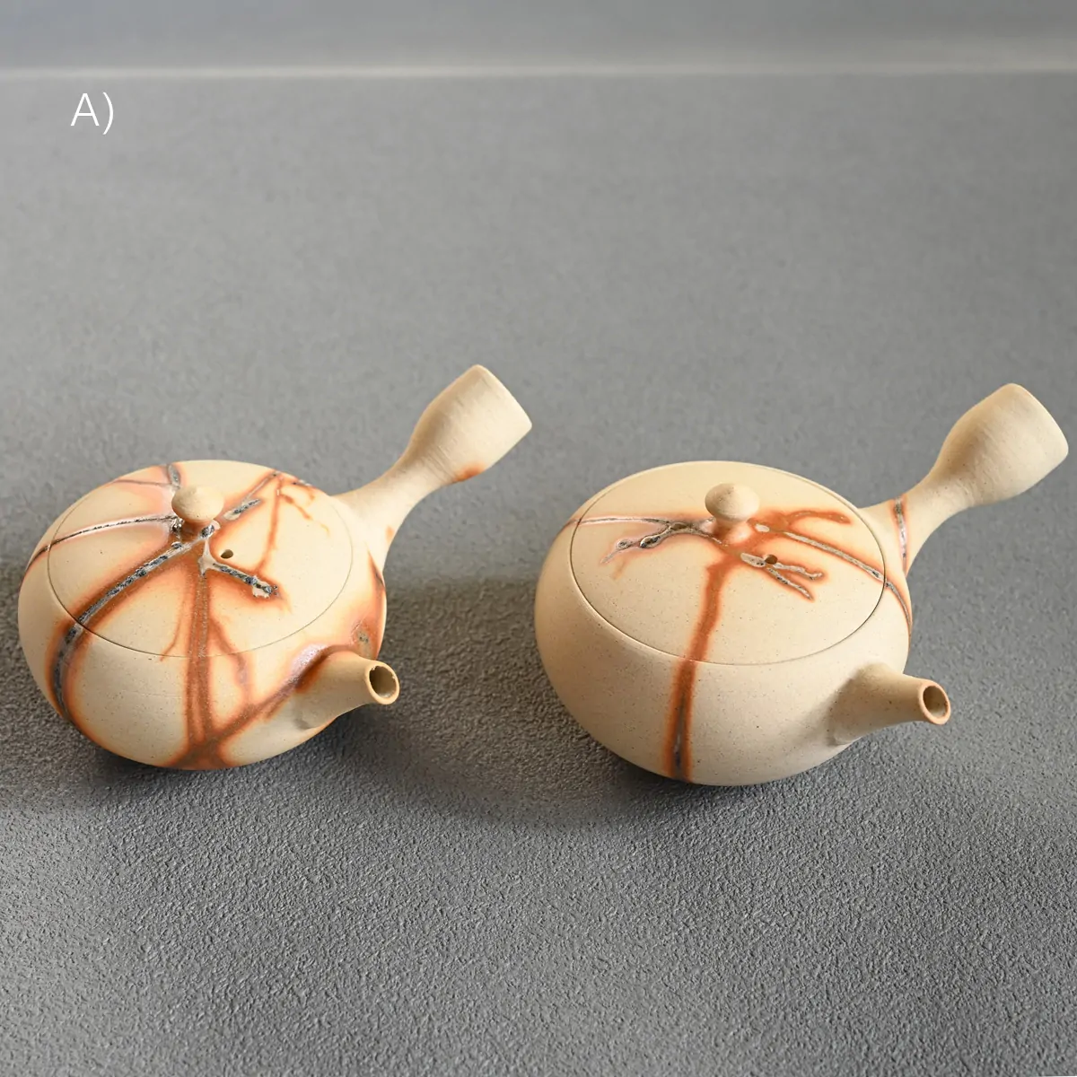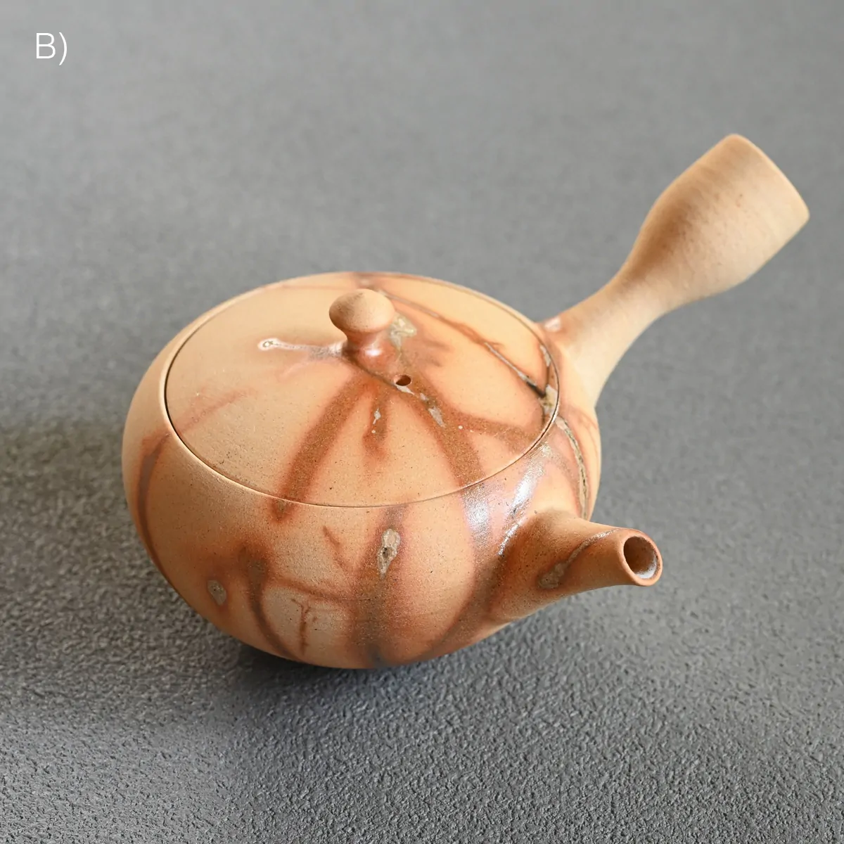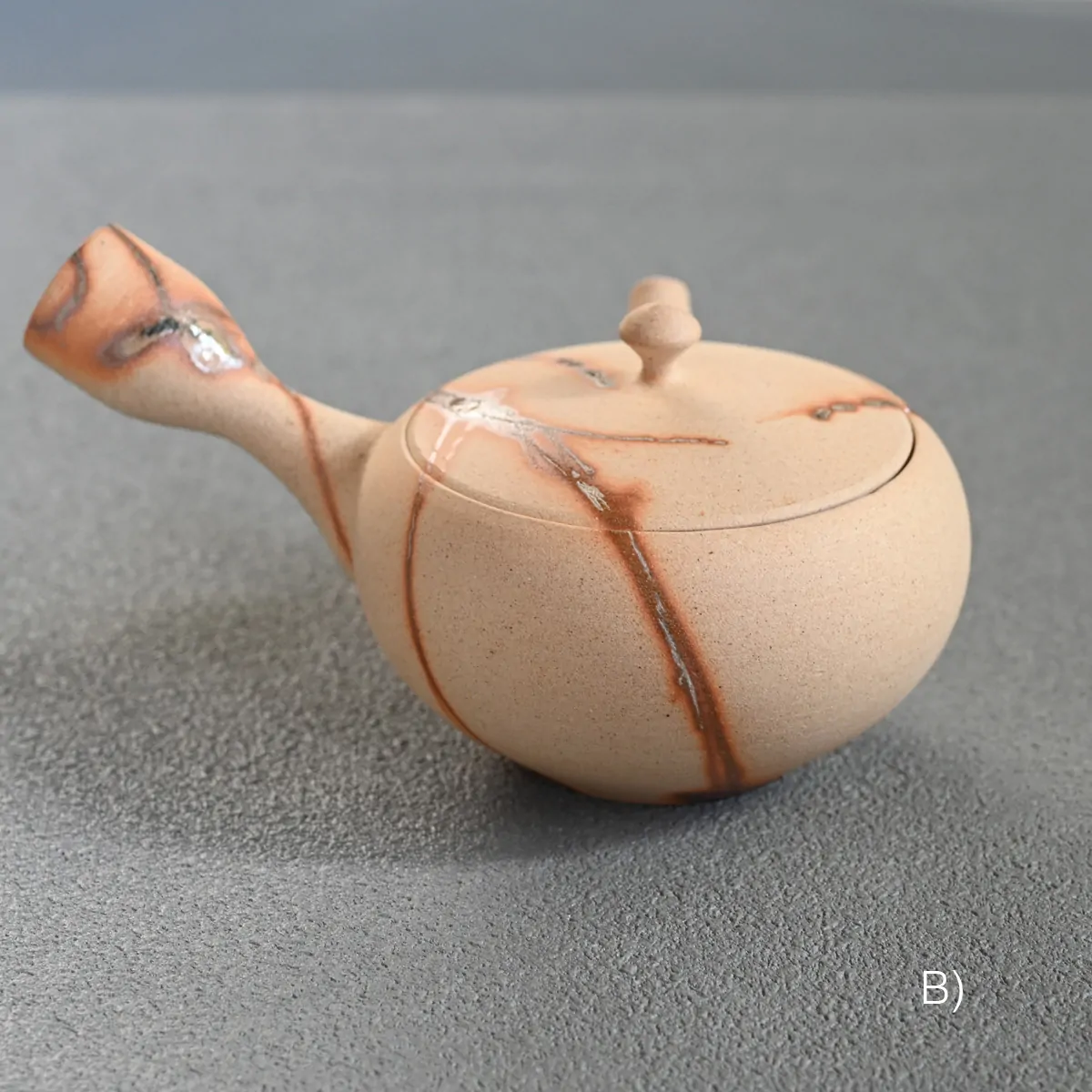 This captivating finish is created using the Hidasuki technique. Before the final firing, the teapot is carefully wrapped in rice straw. As the straw burns, it reacts with the iron in the clay, forming distinctive scarlet streaks known as the Hidasuki pattern. Since the Hidasuki pattern is created through a natural and unpredictable process, each piece will have slight variations in its design. These unique differences enhance the artistic value of the teapot. If you would like to see the exact piece before purchase, please feel free to request photos.