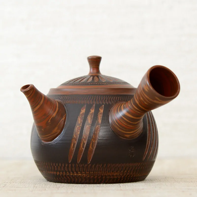 Kyusu made by the Nerikomi method; different color clay is mixed together while the teapot is formed on a wheel. When the form is done, the unique pattern is created by scraping the surface.