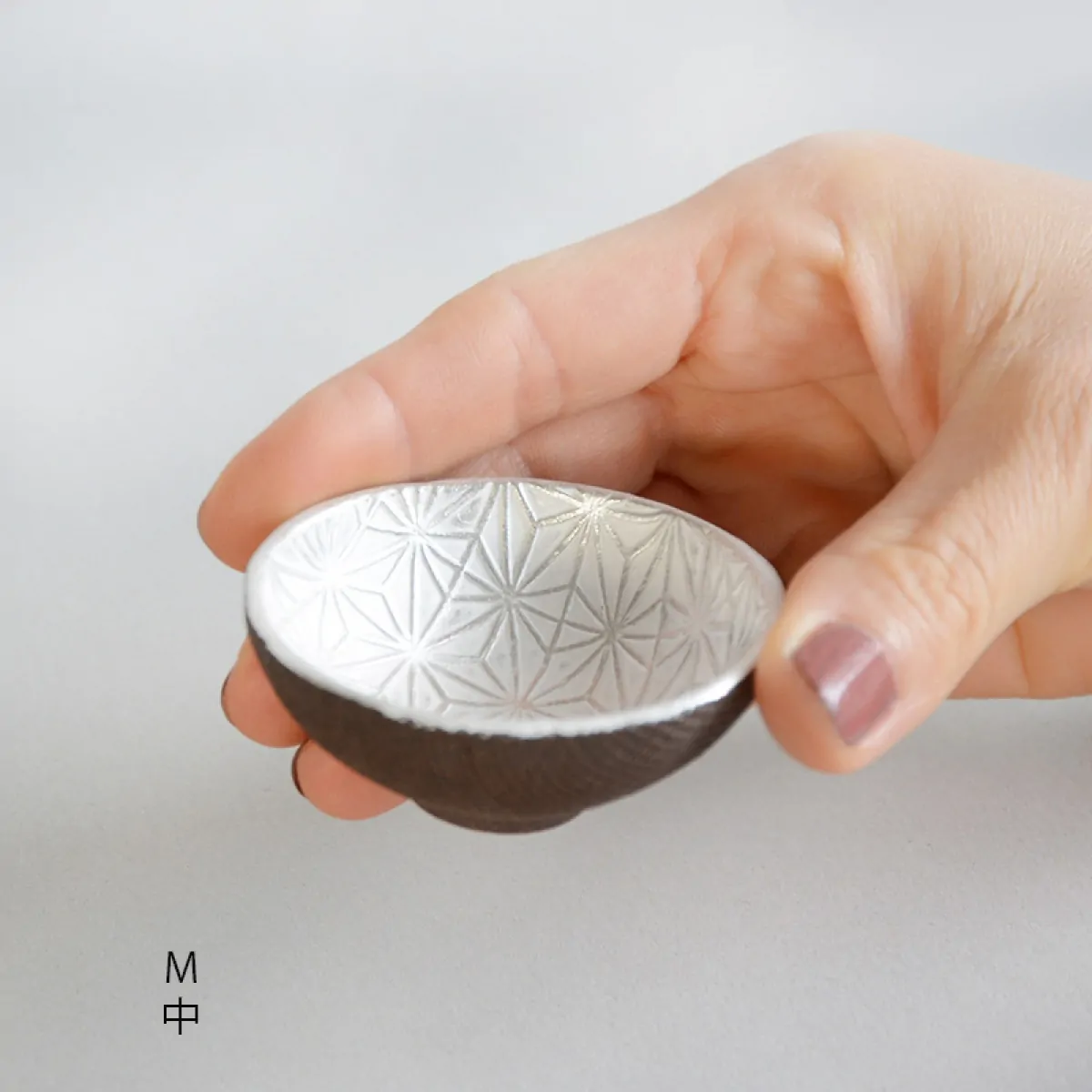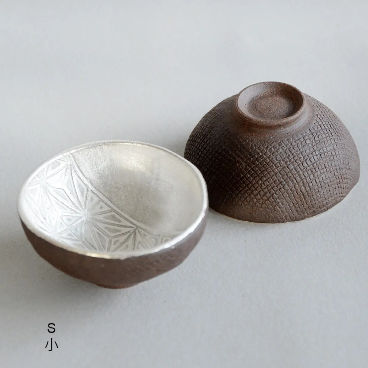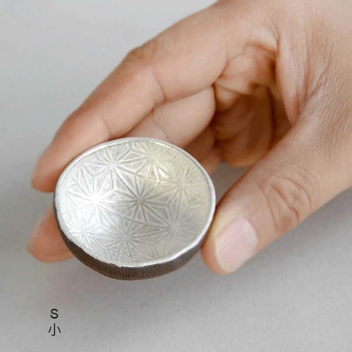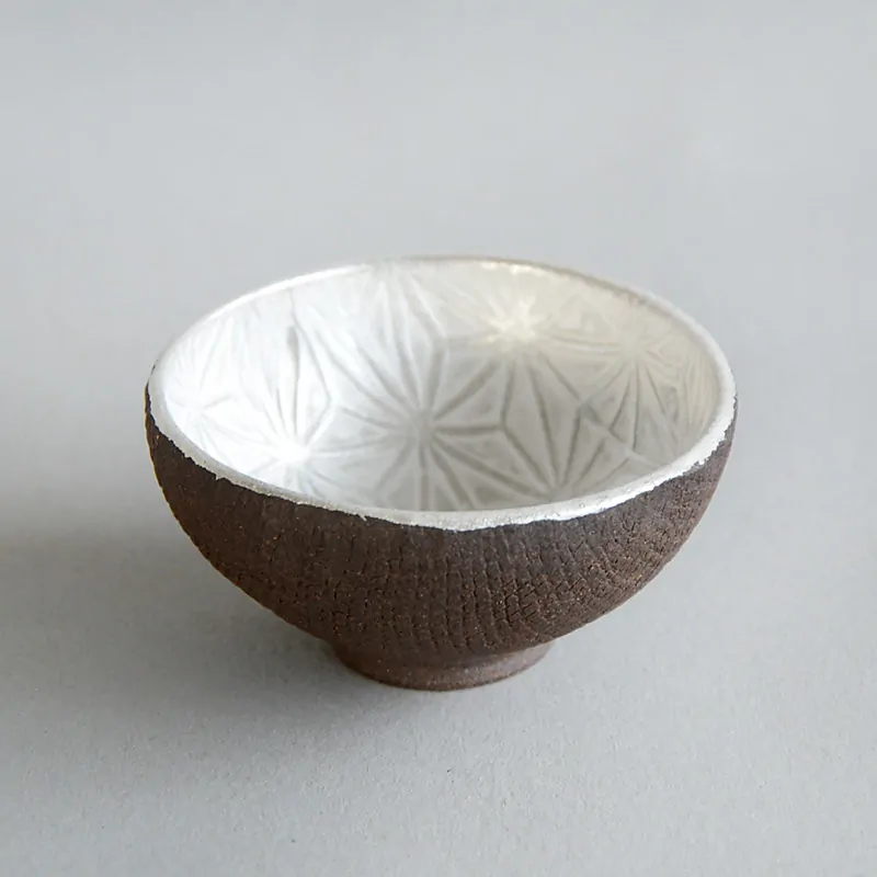 Master Itoh makes these unique teacups with a special technique. First, he presses the clay on a wooden panel with the Asanoha (Hemp leaf) pattern engraved on it, and then in a mold to give it a shape. The bottom is added separately afterward. He applies the silver glaze at the end, before firing. In the kiln, the glaze gets a white patina, which is polished off to recover the pattern and the original silver color.