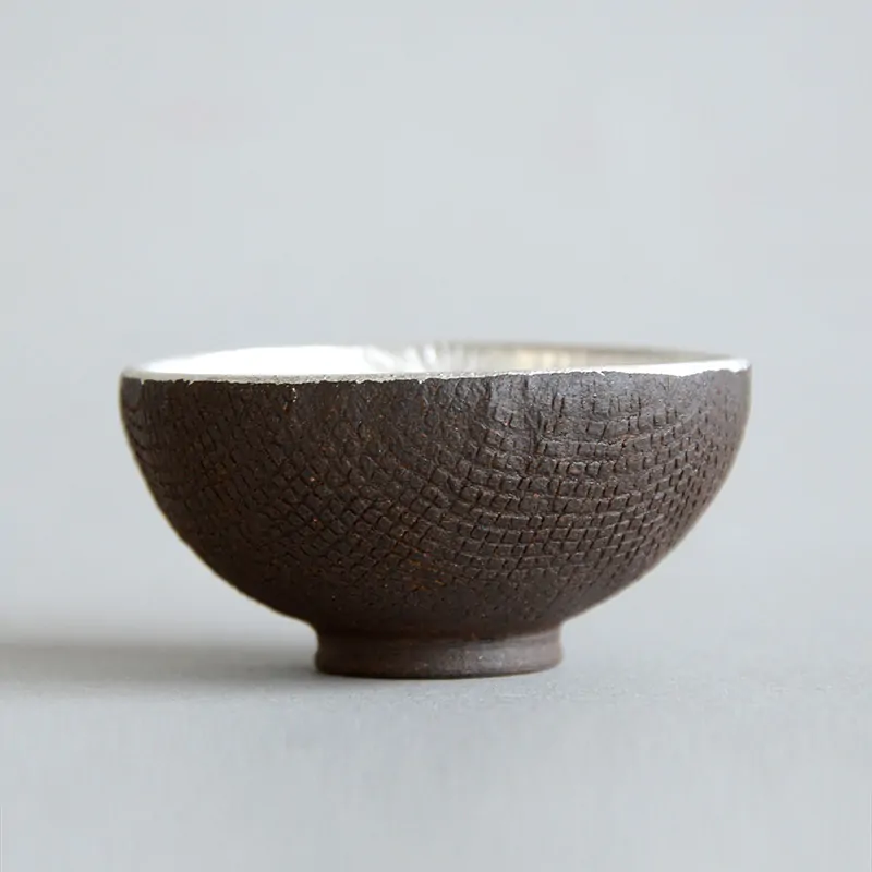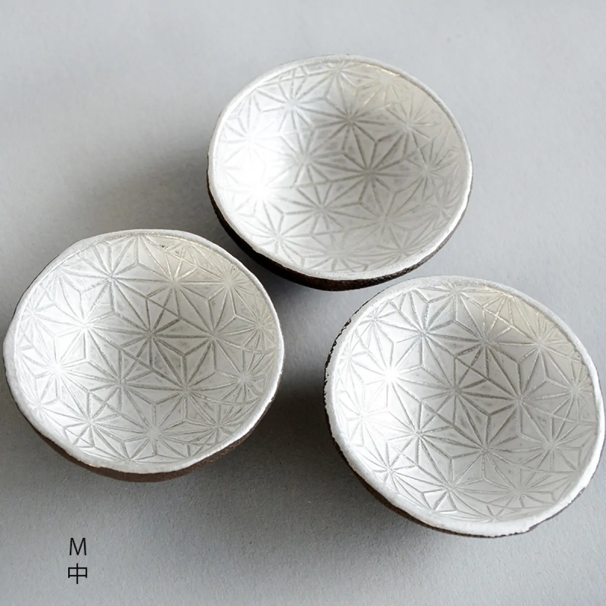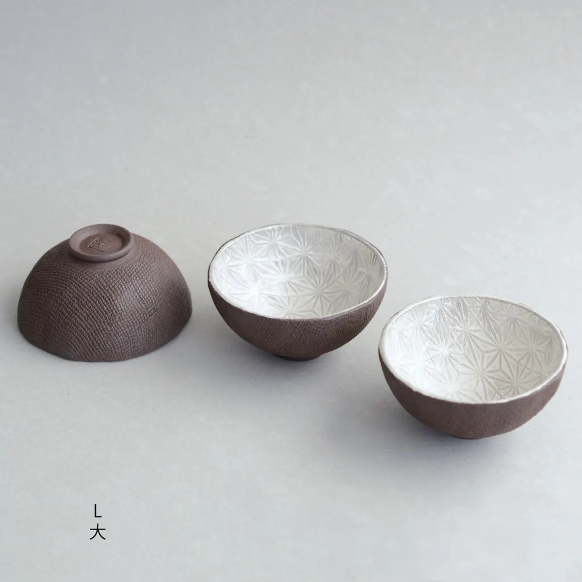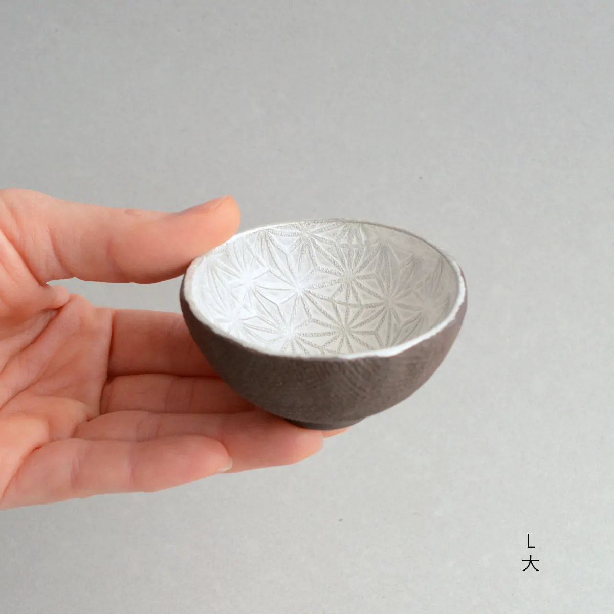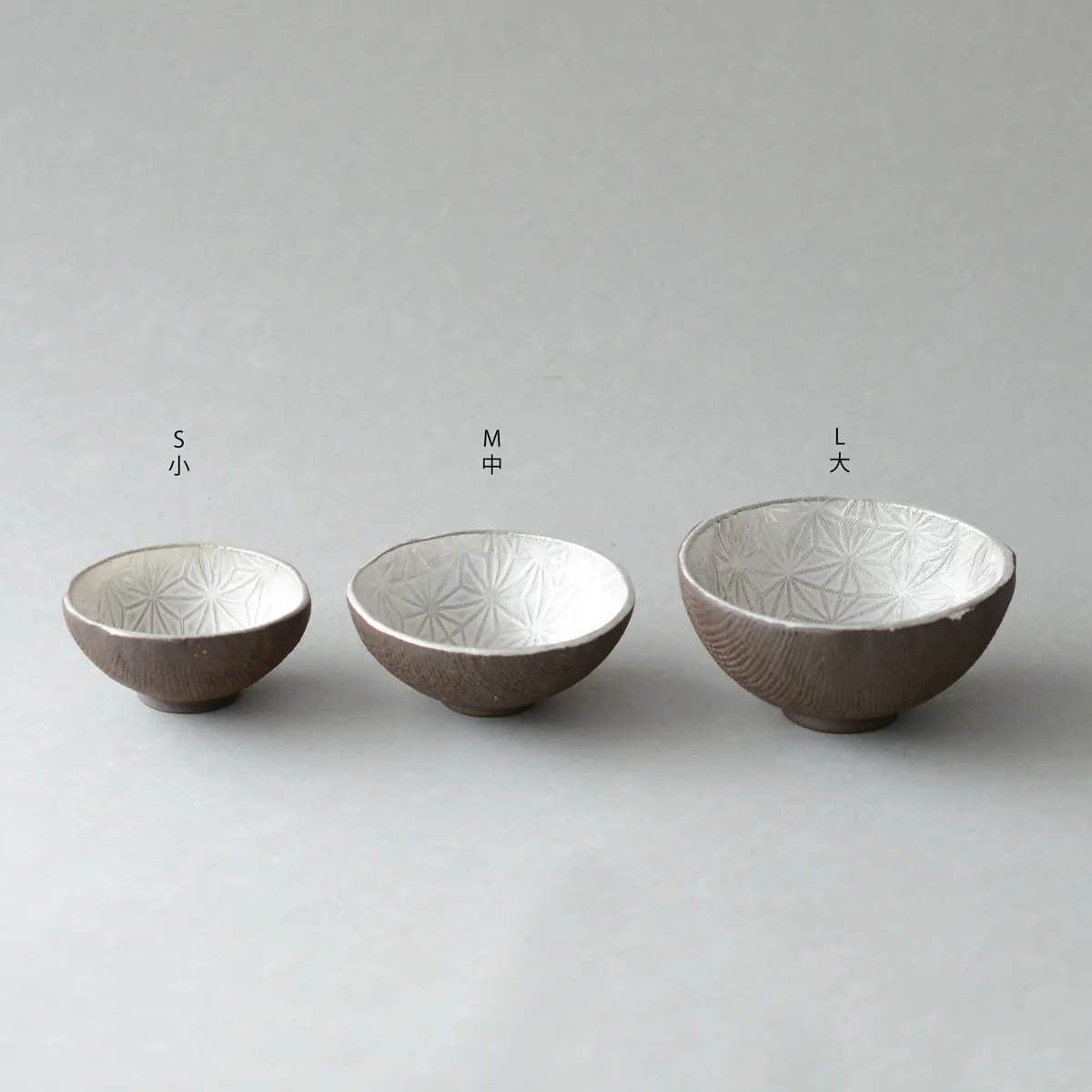 Master Itoh makes these unique teacups with a special technique. First, he presses the clay on a wooden panel with the Asanoha (Hemp leaf) pattern engraved on it, and then in a mold to give it a shape. The bottom is added separately afterward. He applies the silver glaze at the end, before firing. In the kiln, the glaze gets a white patina, which is polished off to recover the pattern and the original silver color.