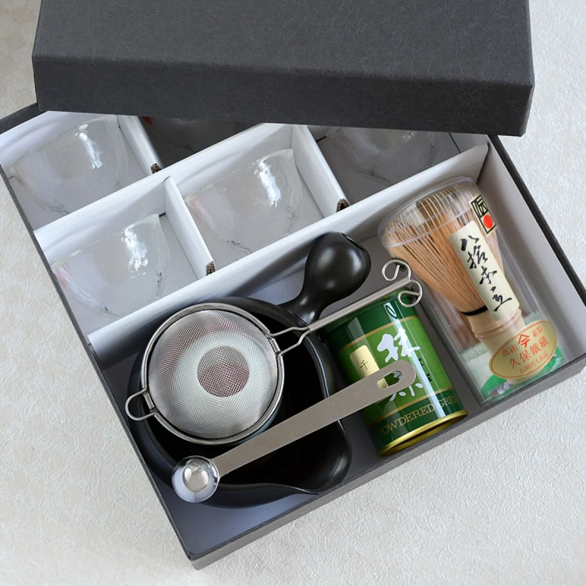 Six-piece matcha tea set for serving tea for a small group of people, in a Japanese paper gift box.