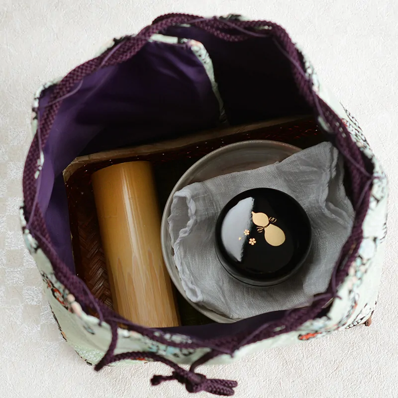 Tea bowl: clay / Tea whisk and tea scoop: bamboo / Portable cart: bamboo, polyester / Cloth: linen / Tea container: plastic