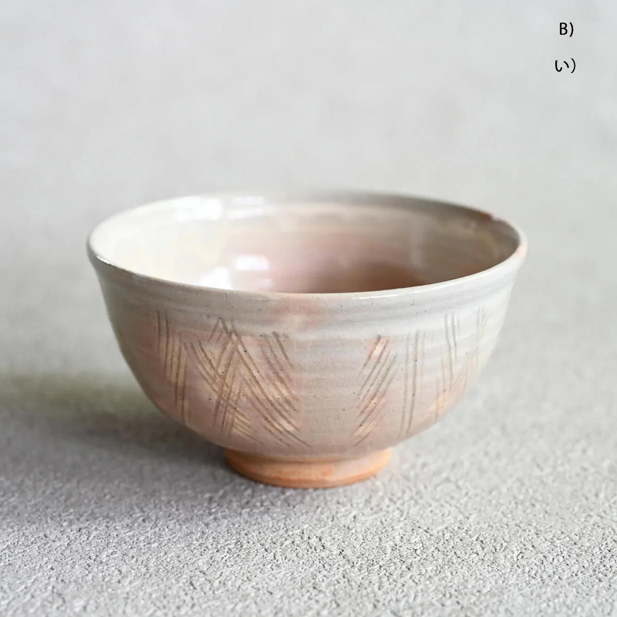 ➤ A chawan of you choice (A) Hakeme Mishima Nodate Chawan, B) Kinkai Nekokakide Nodate Chawan, or C) Koido Nodate Chawan) with a textile coaster