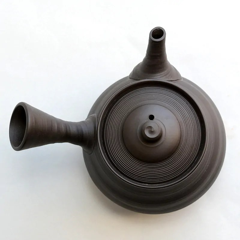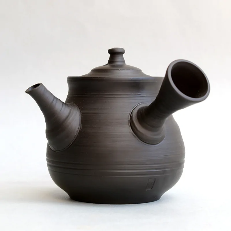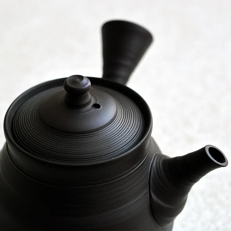 The teapot is fired in a reduction chamber, resulting in a matte black surface. It has yōhen finish. Yōhen in Japanese means "changed by the flame". When the teapot is fired, the heat fluctuates in the kiln, which results in color changes on the surface. This makes every piece unique with the impression of randomness, which has both aesthetic and philosophical appeal to the Japanese.