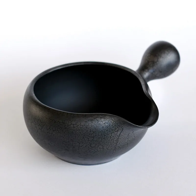 Yuteki Tenmoku glaze got its name from a remote Chinese temple it was first used, on the Tianmu (Tenmoku in Japanese and Heaven's Eye in English) Mountain. From the 13th century, monks in this temple drank their tea from tea bowls glazed with a special technique called yuteki (literally meaning “oil drop”). Tenmoku glazes can range in color and pattern, which makes every glazed piece unique with the impression of randomness, which has both aesthetic and philosophical appeal to the Japanese.