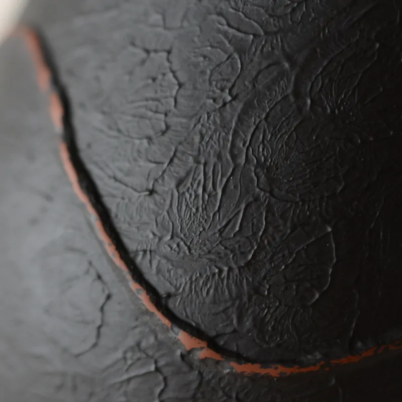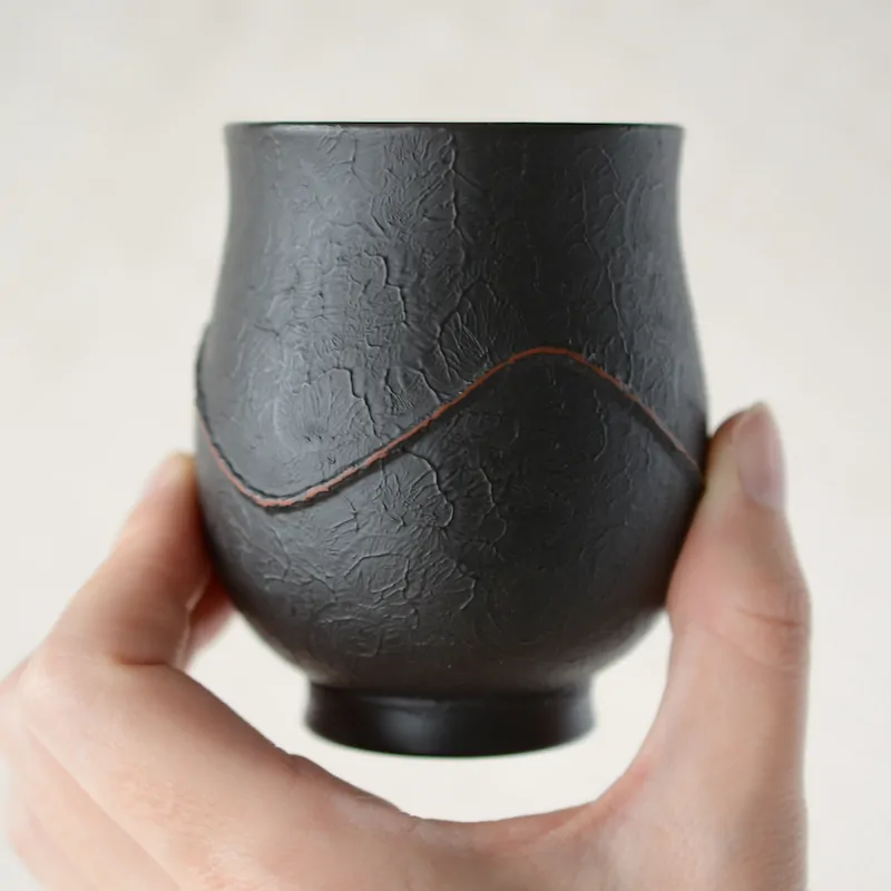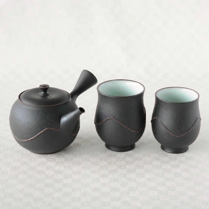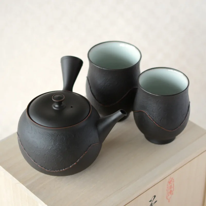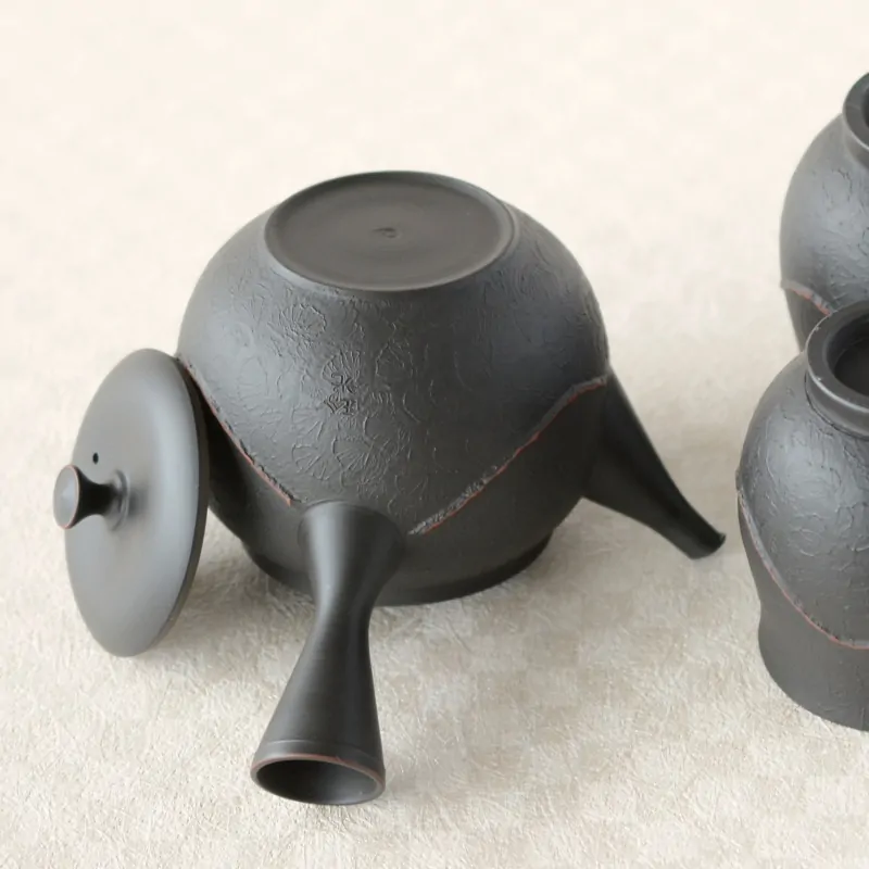 玲光窯の鯉江廣氏の手によって、常滑焼の伝統的技法がモダンな表情へと生まれ変わり、生み出された作品の一つがこちらです。原土を調合してつくりあげるオリジナルの朱泥土が、炭化焼成によって急須を黒く窯変させ、漆黒を作る強い赤を生みます。繊細な模様は、その土肌に削りを入れて描き出され、そこに色土を乗せるという鯉江さん独特の手法によってつくりだされています。 長く使うことで味わい深い艶が出て、自分だけの表情を楽しむことが出来る茶器揃えです。