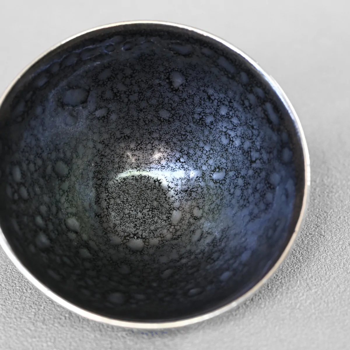 夜空を彷彿とさせる油滴天目と銀色の口縁が美しい作品です。