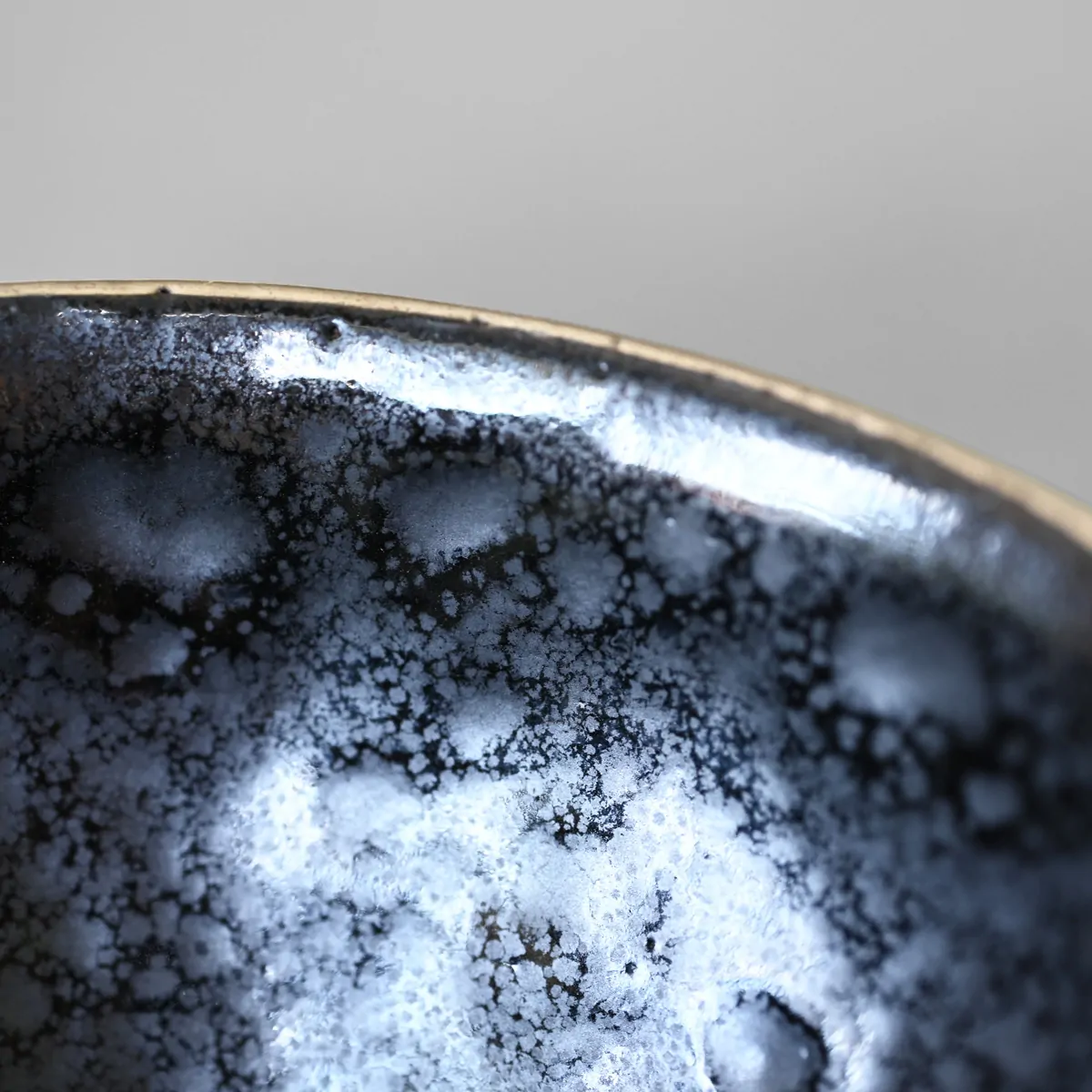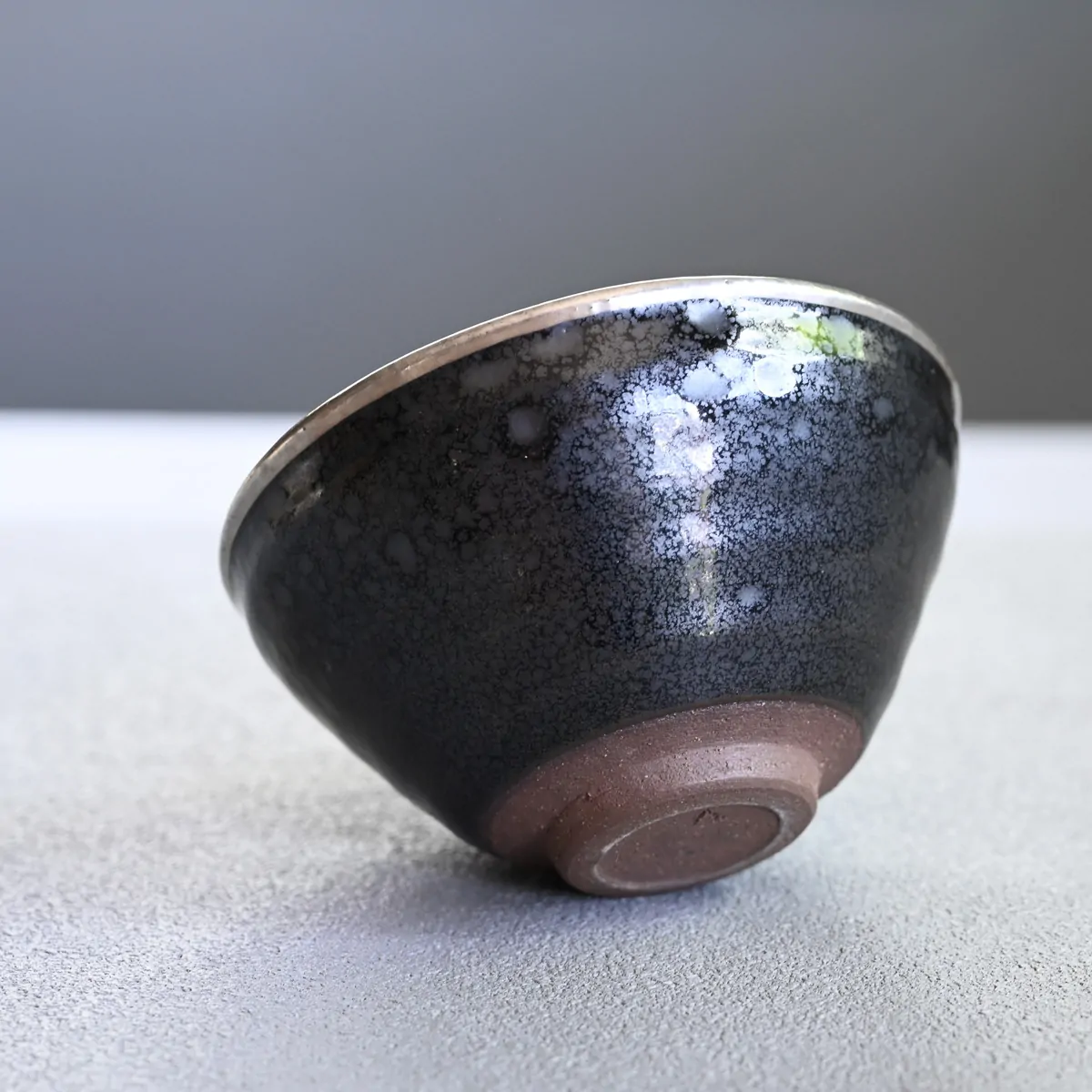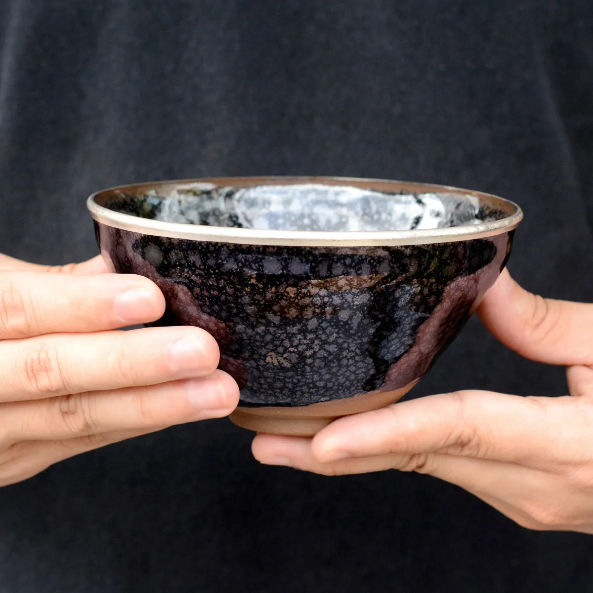 特に「油滴(ゆてき)」と呼ばれる技法では、文字通り油の雫が水面に散ったような銀色の斑紋が浮かび上がり、一点ごとに異なる表情を刻みます。