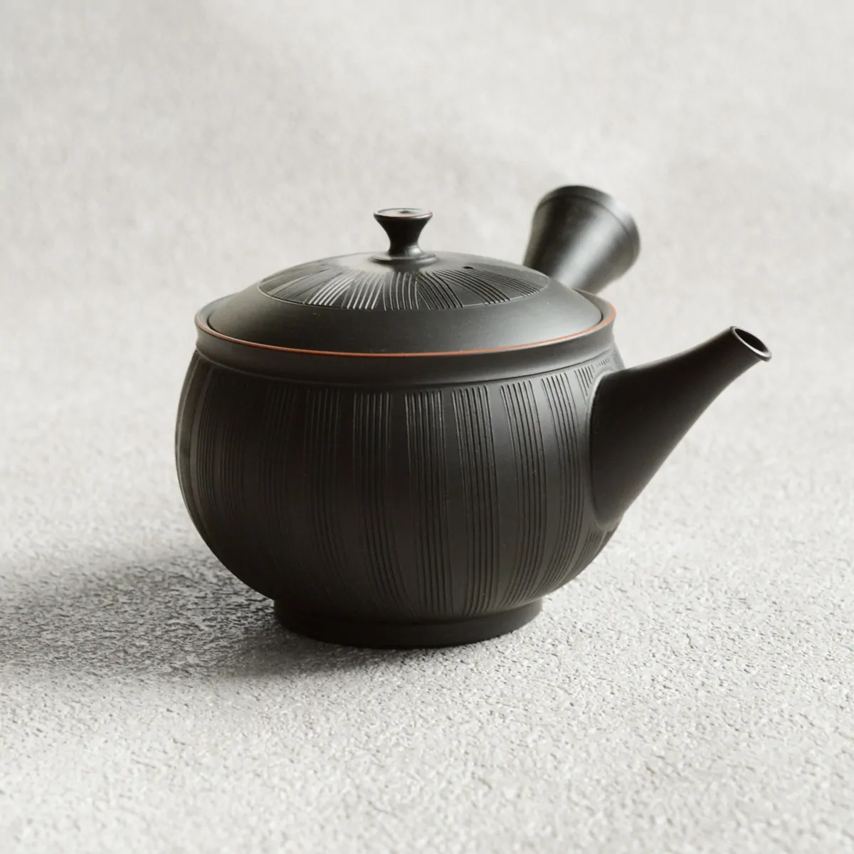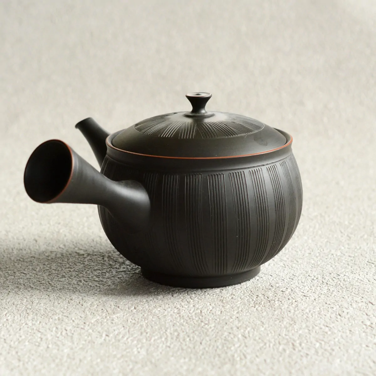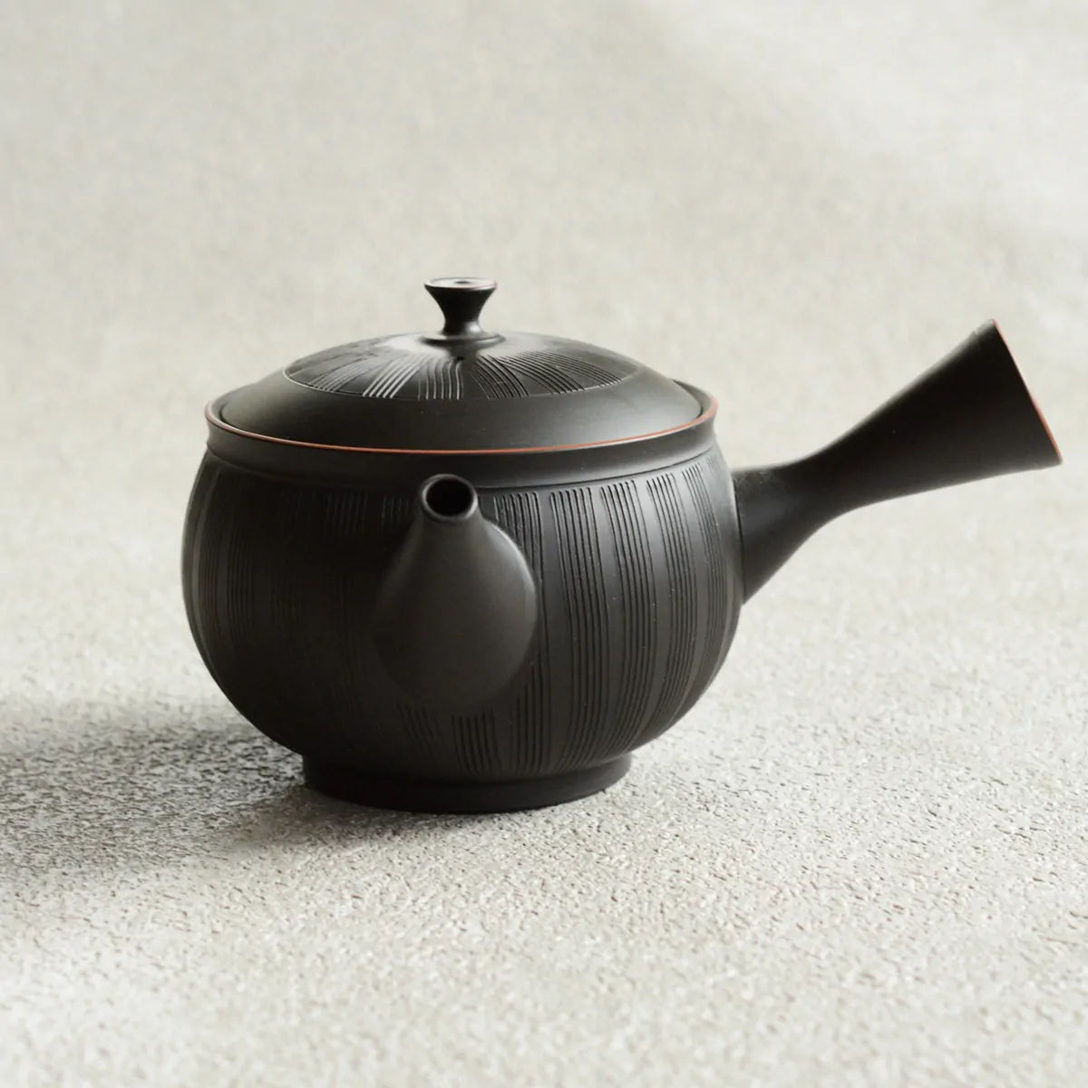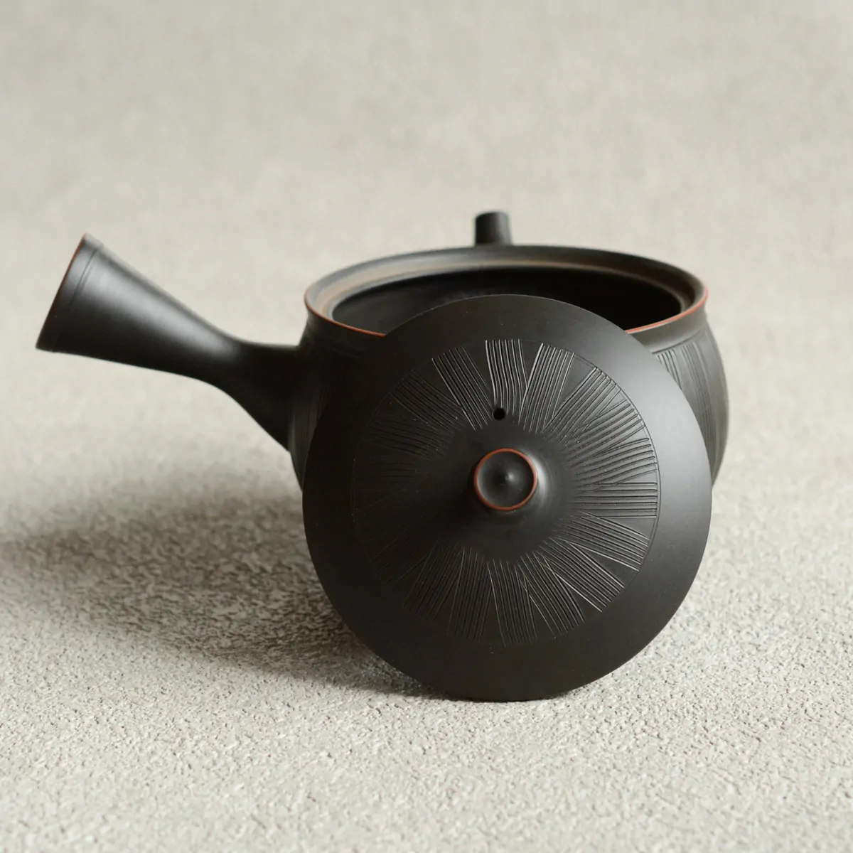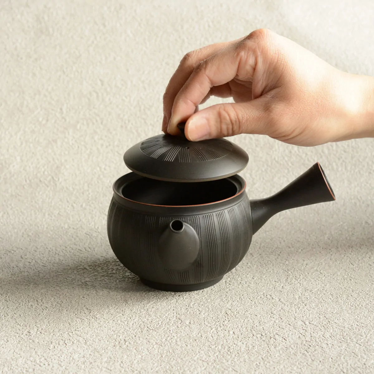 玲光窯の急須の特徴の一つに「すっきり茶こし」をあげることができます。玲光窯の急須の茶こしは、従来の茶こしとは異なり、裏側から手で一つ一つあけられていますので、茶湯の通る穴の入り口が狭く、出口が広いため、茶がらの目づまりがしにくい構造に仕上がっています。