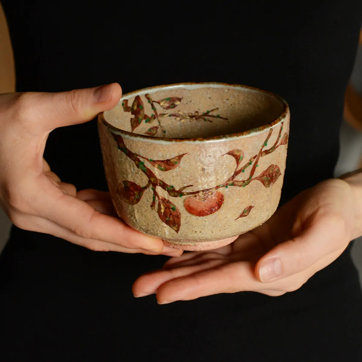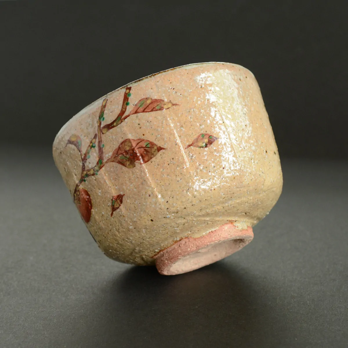 翌年の豊作を願って、晩秋の柿の木に1つだけ残された柿の実が描かれた、灰釉の木守茶碗です。