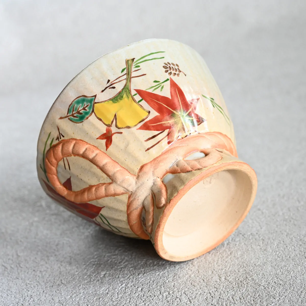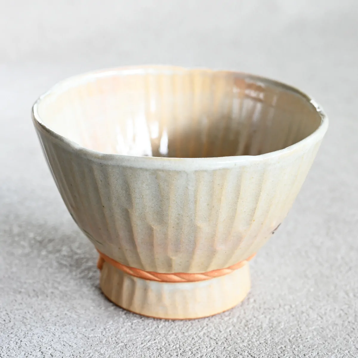 古くより丹波焼などで土の質感を活かして写されてきたこの意匠を、本作では井戸型の造形に繊細な箆(へら)使いで縦に面取りを施し表現しています。