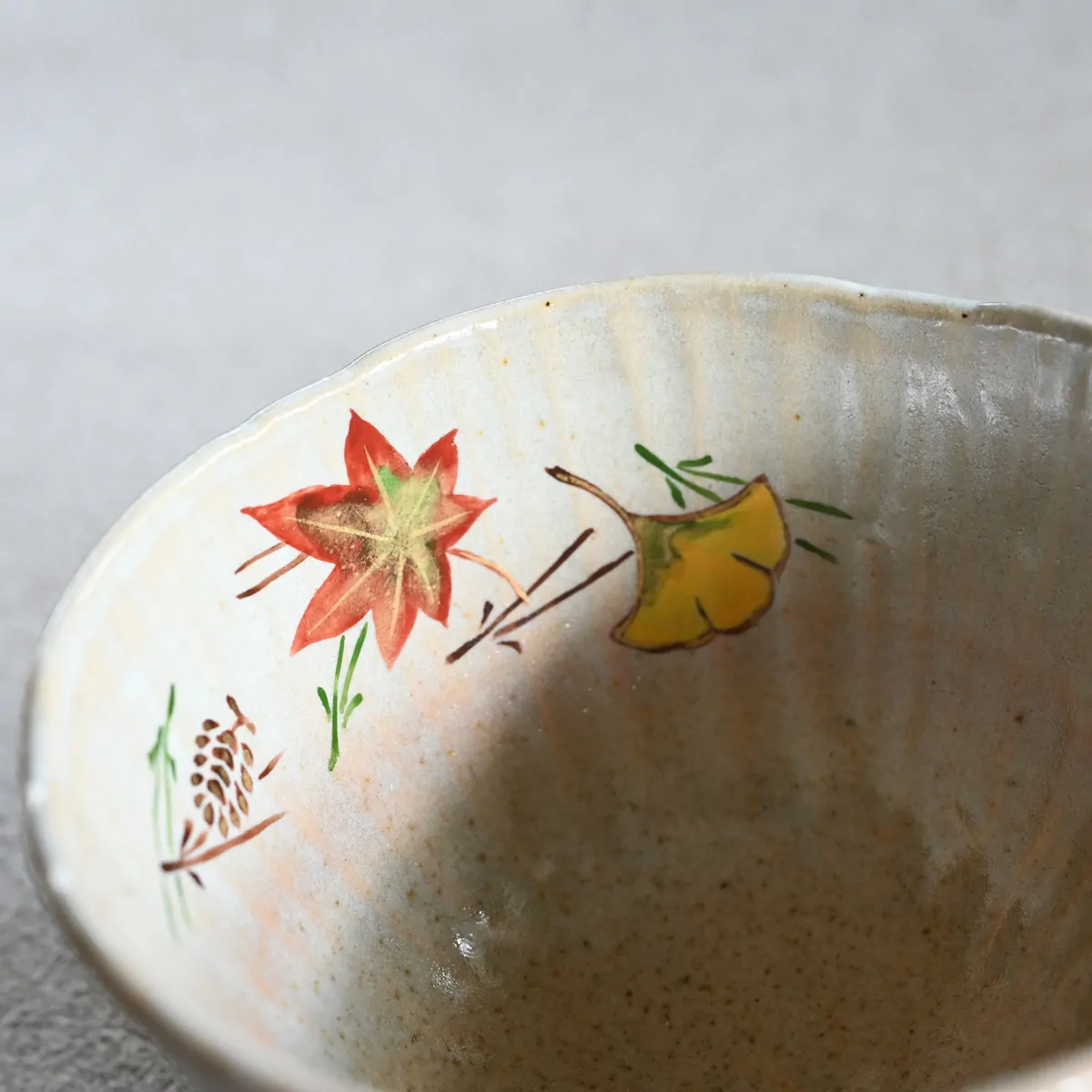 風に舞う木の葉や木の実が一箇所に集う情景は、豊かな実りを象徴する吉祥の意匠です。