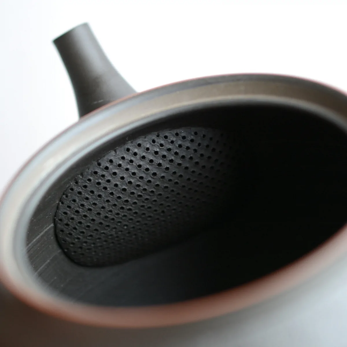 玲光窯の急須の特徴の一つに「すっきり茶こし」をあげることができます。玲光窯の急須の茶こしは、従来の茶こしとは異なり、裏側から手で一つ一つあけられていますので、茶湯の通る穴の入り口が狭く、出口が広いため、茶がらの目づまりがしにくい構造に仕上がっています。