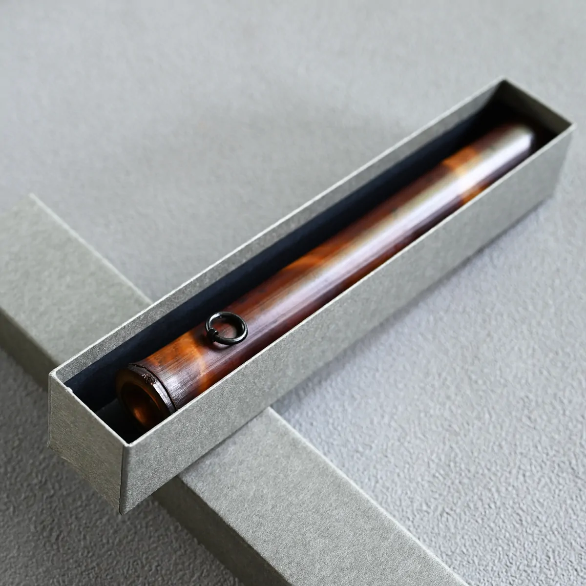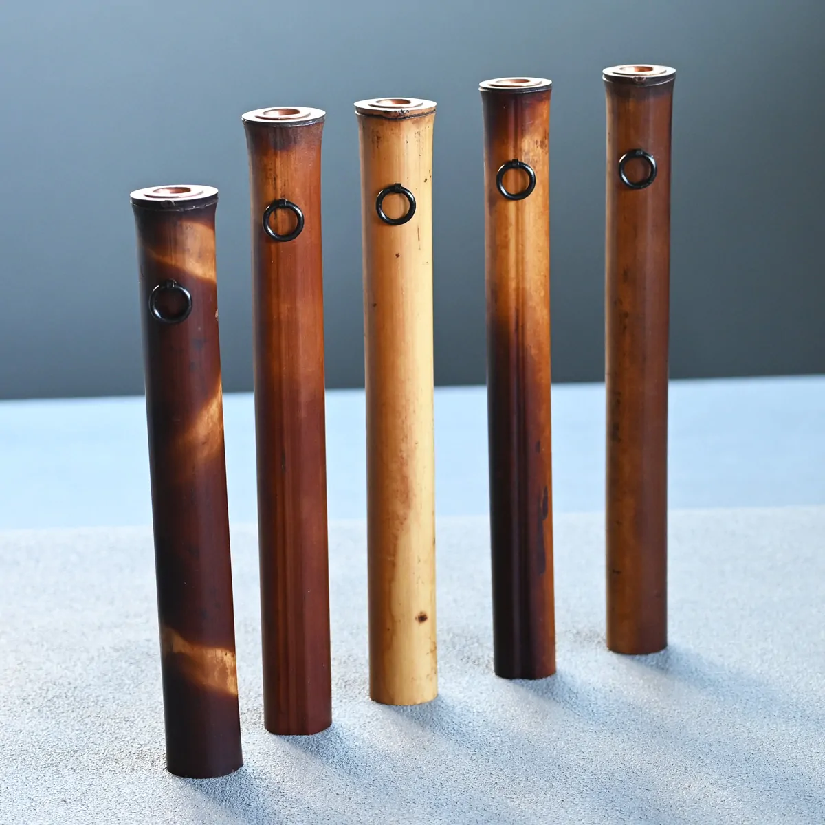 茅葺き屋根などの民家の建材として用いられた竹が、囲炉裏の煤によって百年以上燻され生まれる深みのある茶褐色やあめ色の竹を本煤竹と言います。茅葺き屋根や囲炉裏を見る機会も少なくなる現代では、この本煤竹は私たちにとってとても貴重な素材のひとつです。