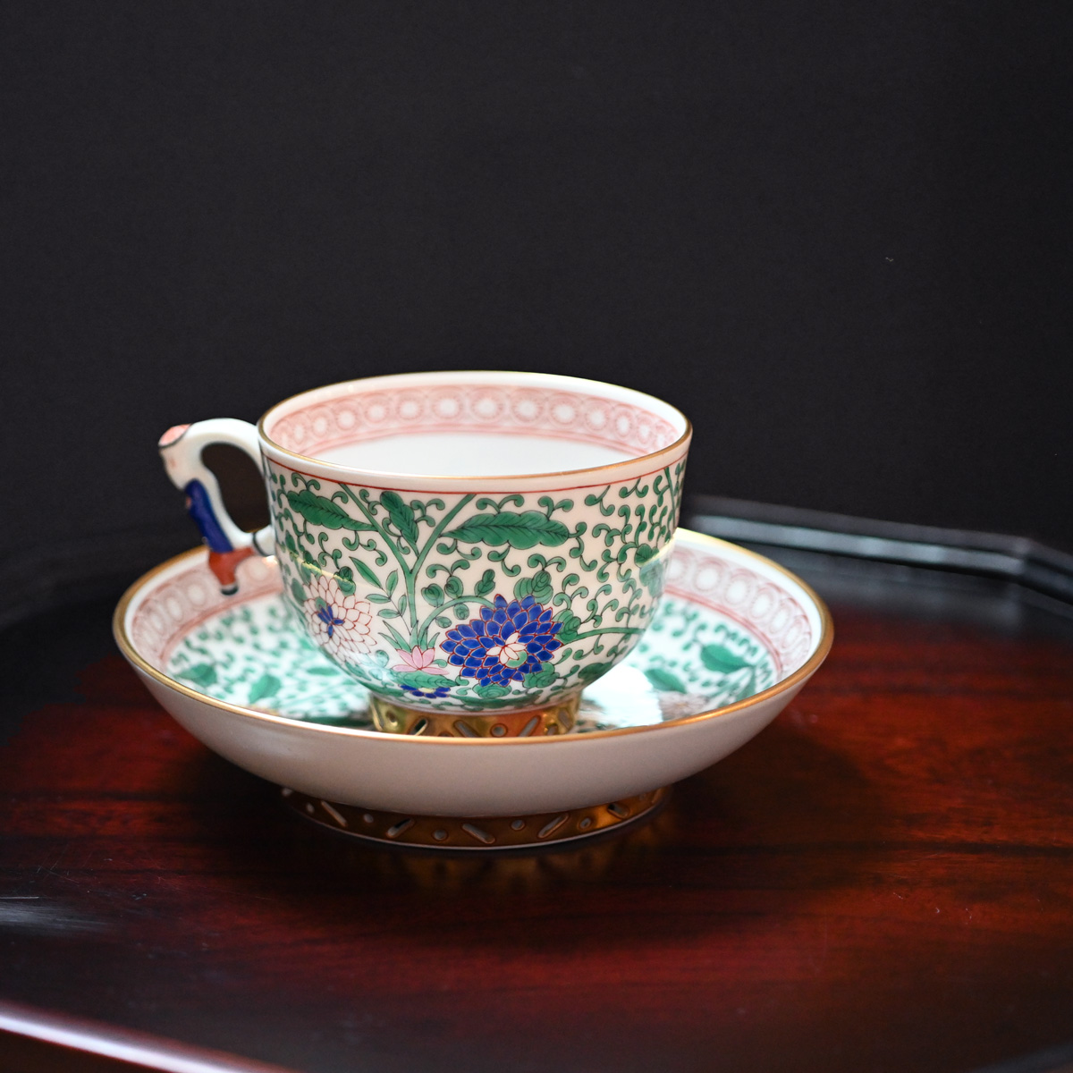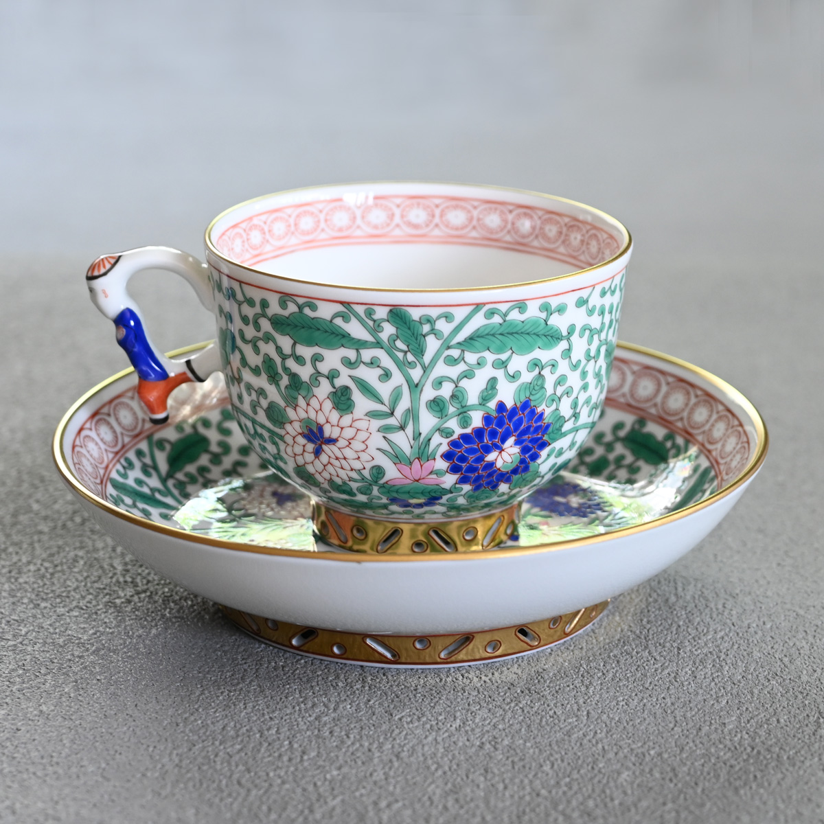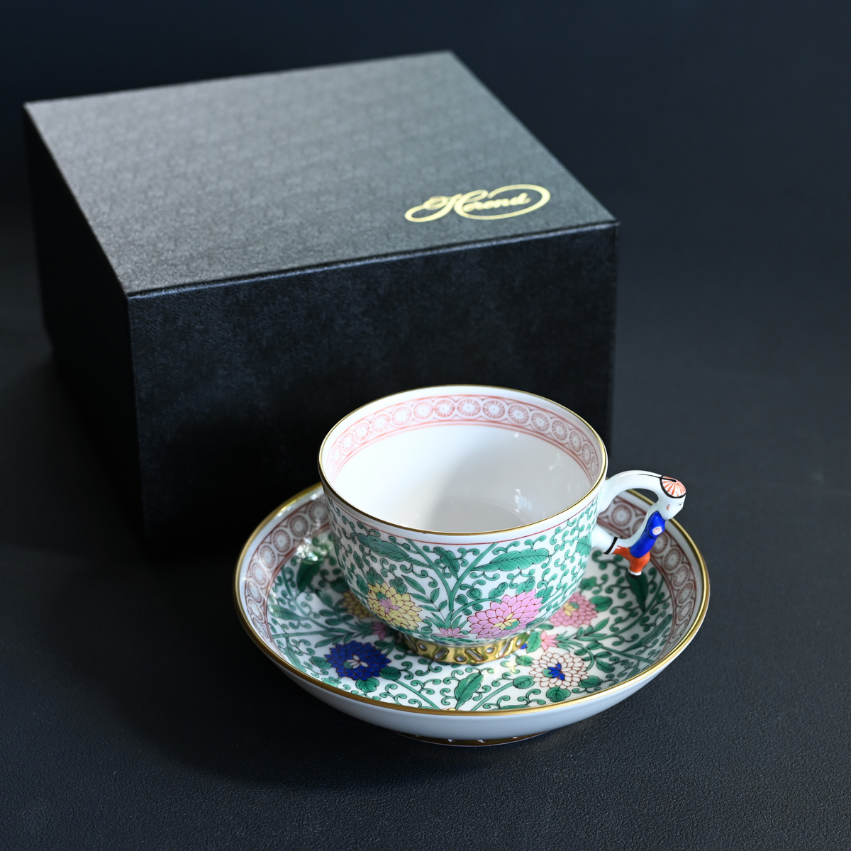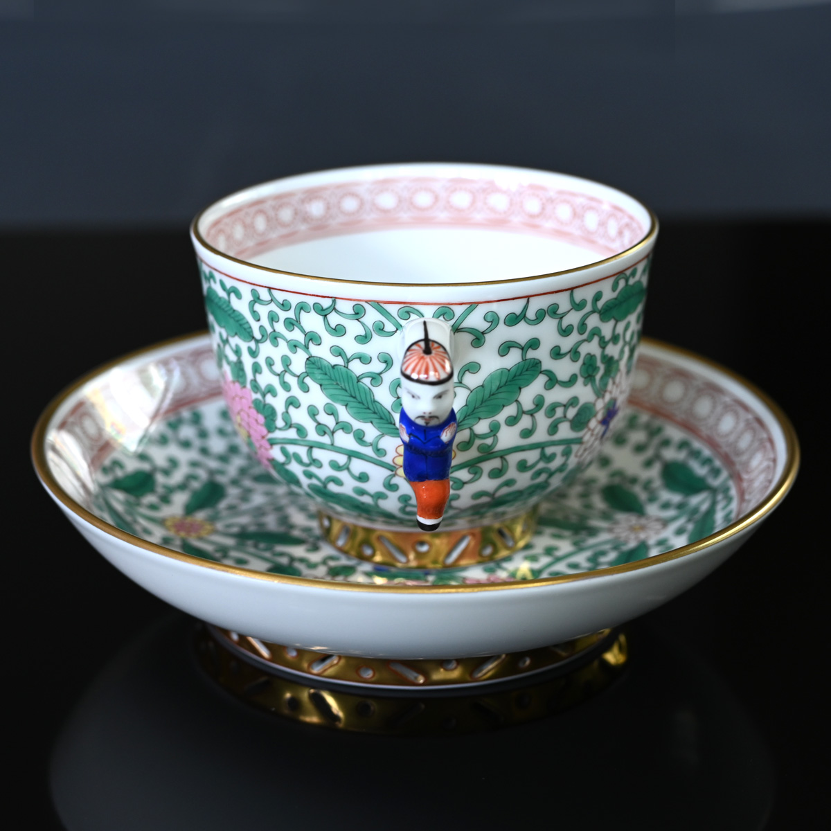 ている。カップの取っ手にはヘレンドのキャラクター「マンダリン」