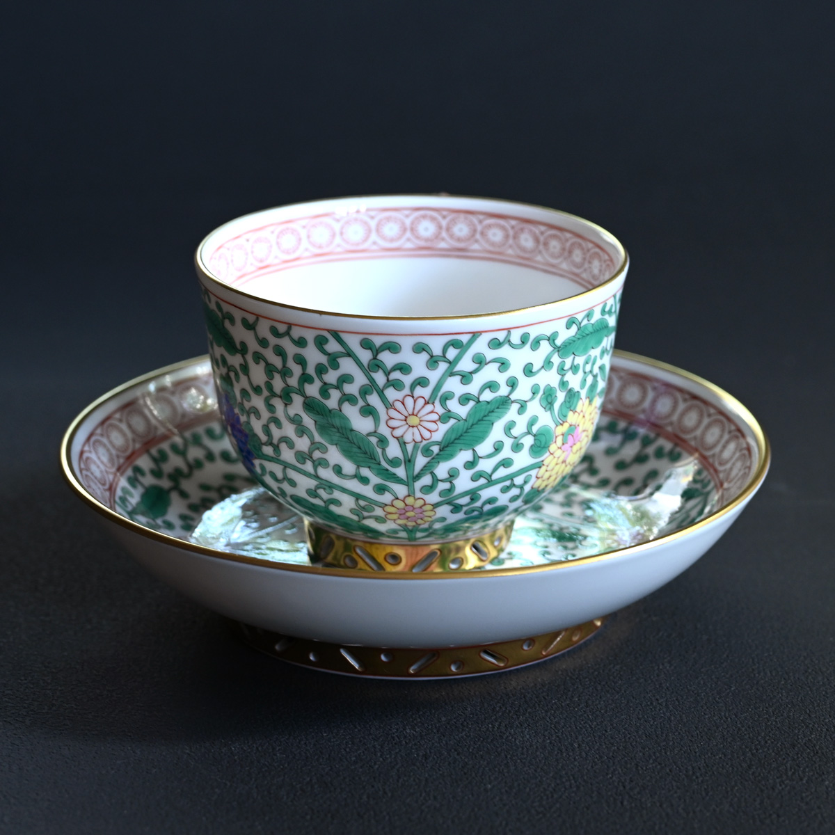 特徴としてラージカップ、ソーサーとも高台部分が透かし彫りになっ