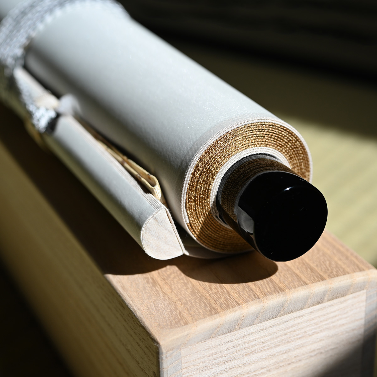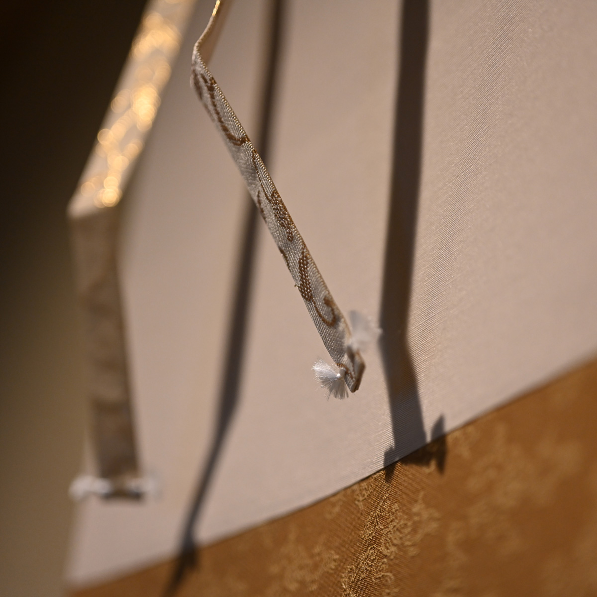 この書は紙に描かれ、3種類の布で額装されています。シンプルな無地の綿布と、刺繍が施された絹布「貴船」と「竹屋町緞子」の2種類です。書の額装を縁取る金色の刺繍が施された絹布「竹屋町時金緞子」は、室町時代から京都で魅惑的な唐草模様の織物で有名な竹屋通りにちなんで名付けられました。
