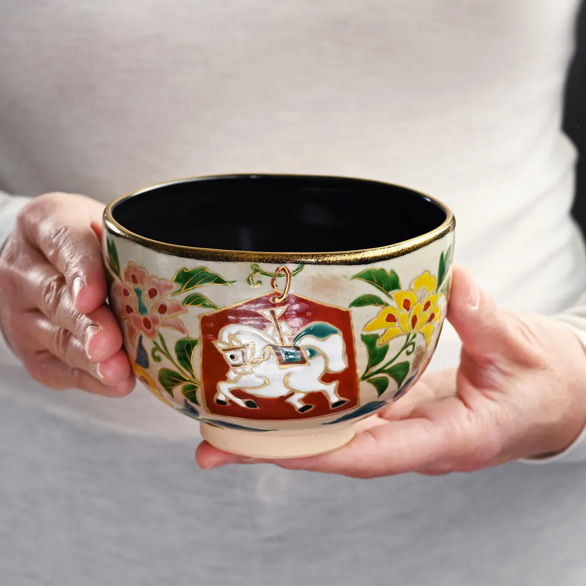 茶碗の内側は黒く仕上げられ、点てた抹茶の鮮やかな緑をより一層引き立てます。