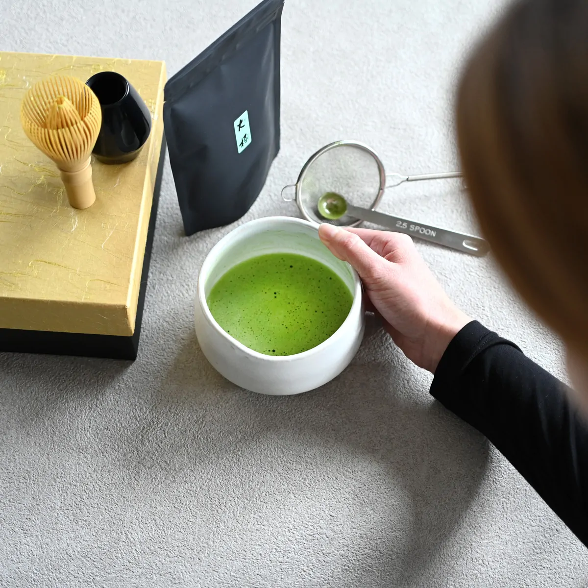 ❖抹茶パウダーが固まるのを防ぐために、お抹茶をたてる前に高品質な茶こしでお抹茶をふるいにかけて、濾していただくことをおすすめします。