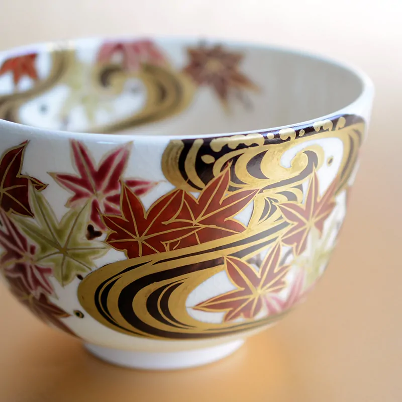 こちらの紅葉の見事な抹茶茶碗は、共箱に入れてお送りします。